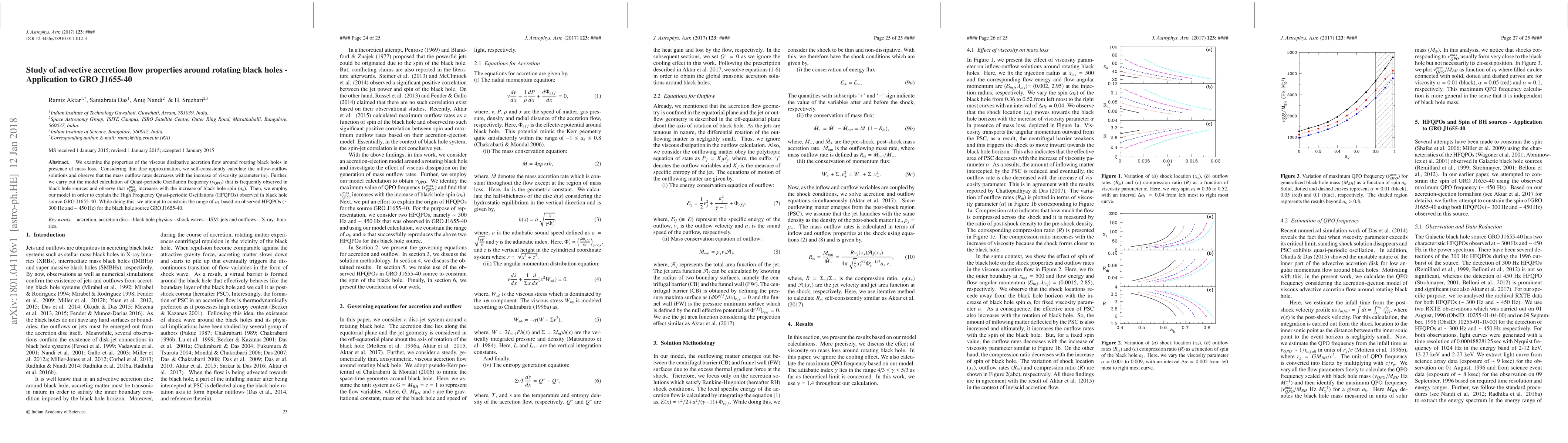 We examine the properties of the viscous dissipative accretion flow around rotating black holes in presence of mass loss. Considering thin disc approximation, we self-consistently calculate the inflow-outflow solutions and observe that the mass outflow rates decreases with the increase of viscosity parameter ($\alpha$). Further, we carry out the model calculation of Quasi-periodic Oscillation frequency ($\nu_{\rm QPO}$) that is frequently observed in black hole sources and observe that $\nu^{\rm max}_{\rm QPO}$ increases with the increase of black hole spin ($a_k$). Then, we employ our model in order to explain the High Frequency Quasi-periodic Oscillations (HFQPOs) observed in black hole source GRO J1655-40. While doing this, we attempt to constrain the range of $a_k$ based on observed HFQPOs ($\sim$ 300 Hz and $\sim$ 450 Hz) for the black hole source GRO J1655-40.