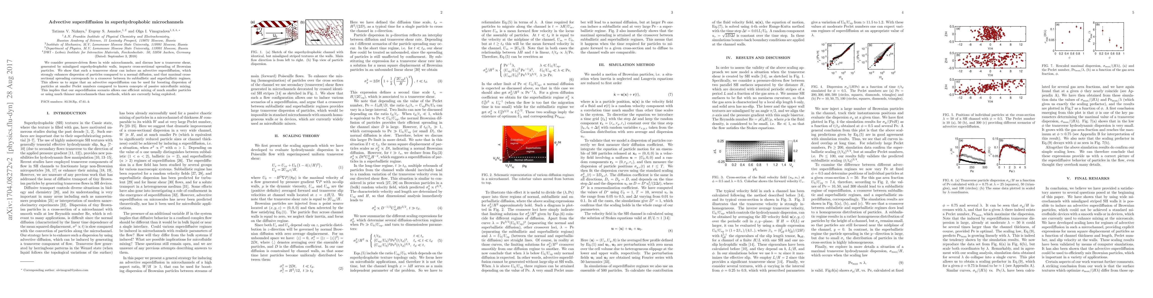 This paper investigates pressure-driven flows in superhydrophobic microchannels, demonstrating that transverse shear from misaligned walls induces advective superdiffusion, significantly enhancing particle dispersion compared to normal diffusion. The study suggests this phenomenon can improve mixing efficiency for smaller particles or thinner channels than current methods.