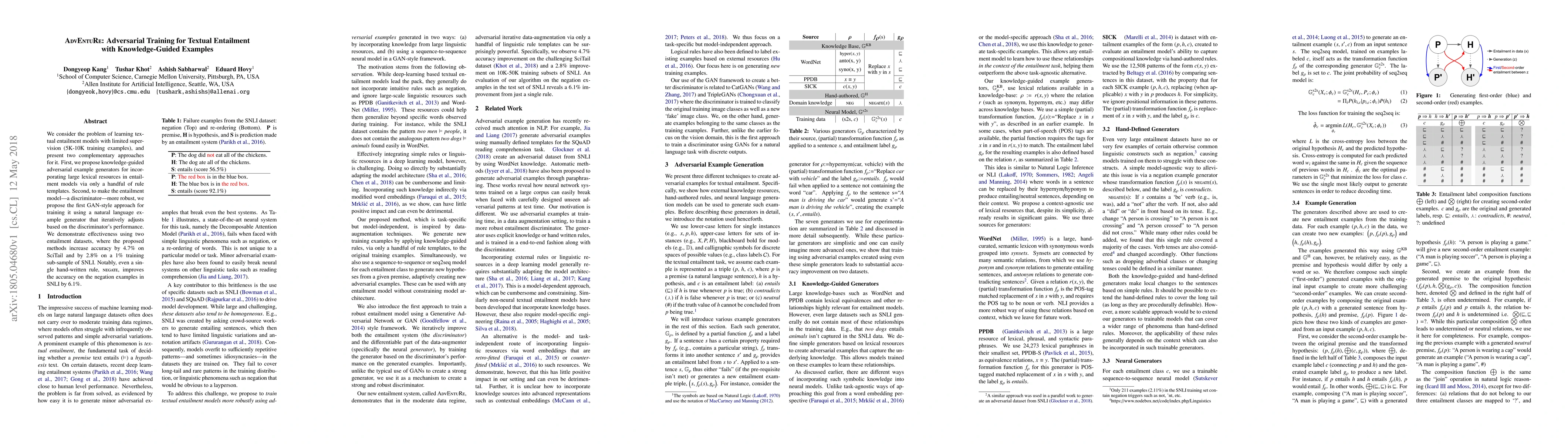 This paper proposes two methods to improve textual entailment models with limited supervision: knowledge-guided adversarial example generators and a GAN-style training approach. The results show a 4.7% accuracy increase on SciTail and a 2.8% increase on a 1% training sub-sample of SNLI.