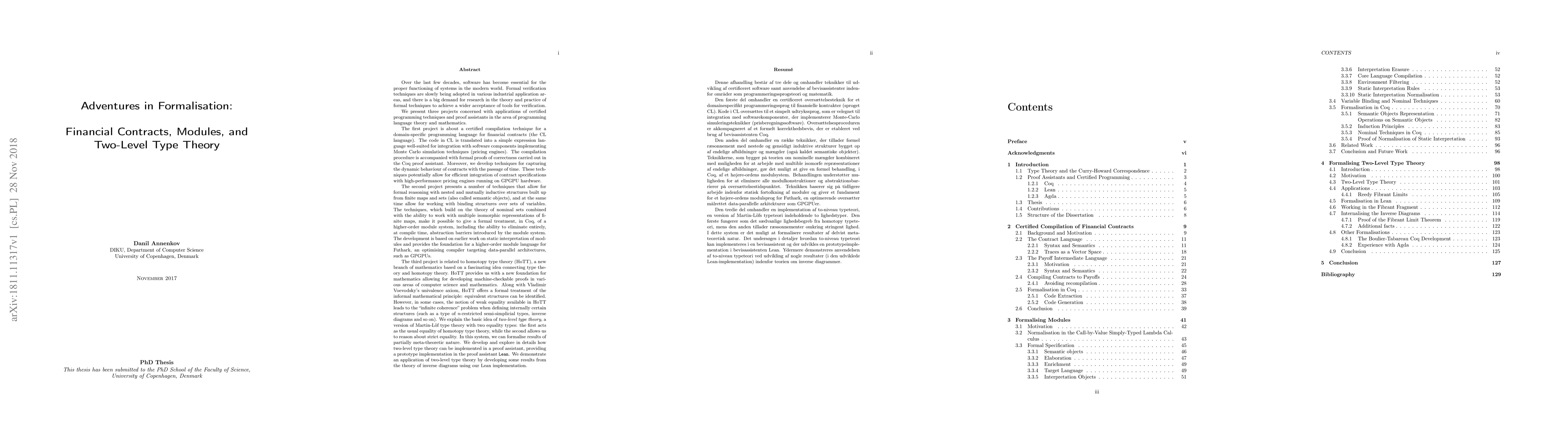 Researchers develop three projects that apply proof assistants to improve programming language theory and mathematics, including certified compilation techniques for financial contracts and a two-level type theory for formal reasoning about strict equality.