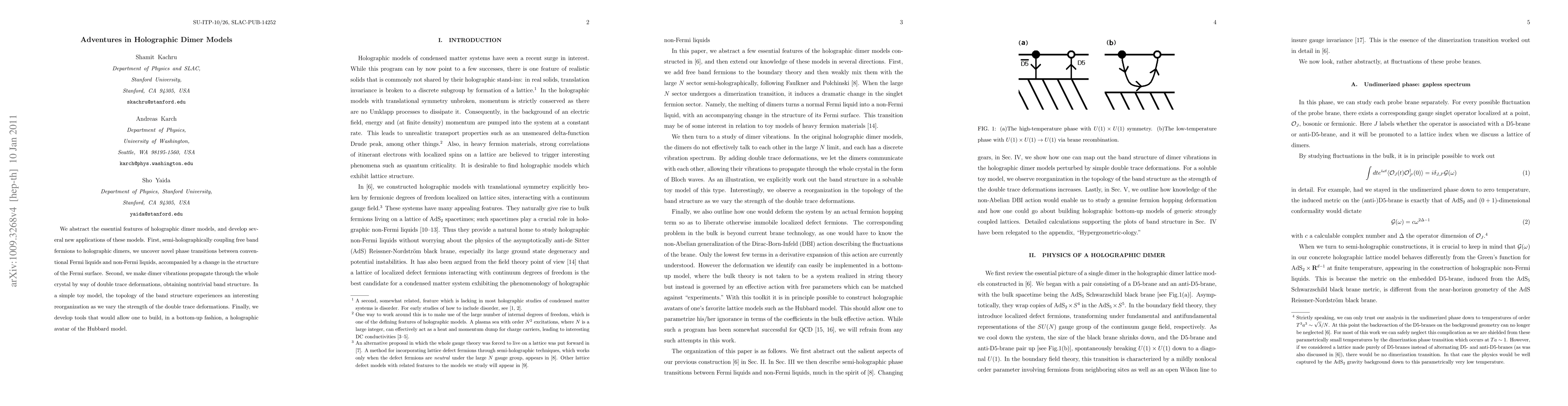 This paper abstracts holographic dimer models to uncover novel phase transitions between Fermi and non-Fermi liquids, explores dimer vibrations' propagation via double trace deformations, and develops tools for constructing a holographic version of the Hubbard model.
