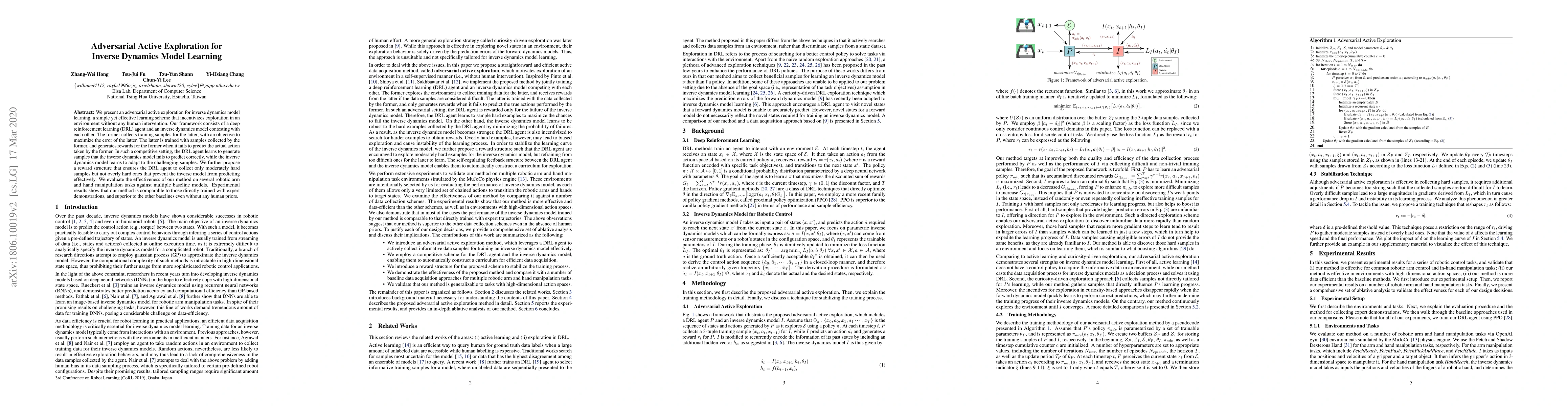 This paper proposes an adversarial active exploration method for learning inverse dynamics models using a deep reinforcement learning agent that competes with the model to incentivize exploration without human intervention. The method effectively generates challenging samples for model training, leading to comparable performance to models trained with expert demonstrations, while outperforming other baselines.