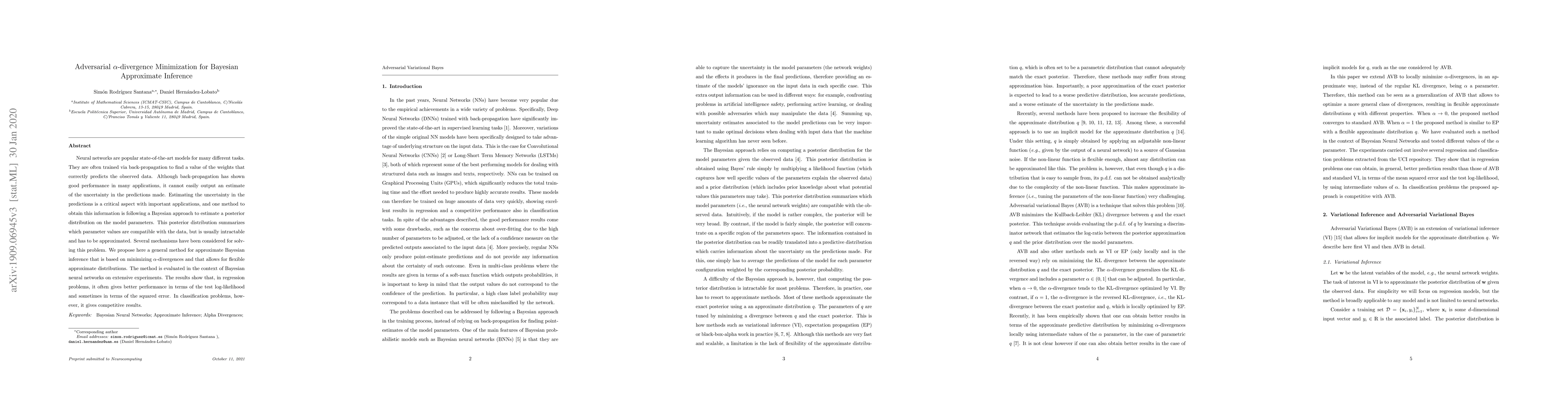 This paper proposes a method for adversarial $\alpha$-divergence minimization to approximate Bayesian inference in neural networks, offering flexible approximate distributions. The approach shows improved performance in regression tasks in terms of test log-likelihood and competitive results in classification tasks.