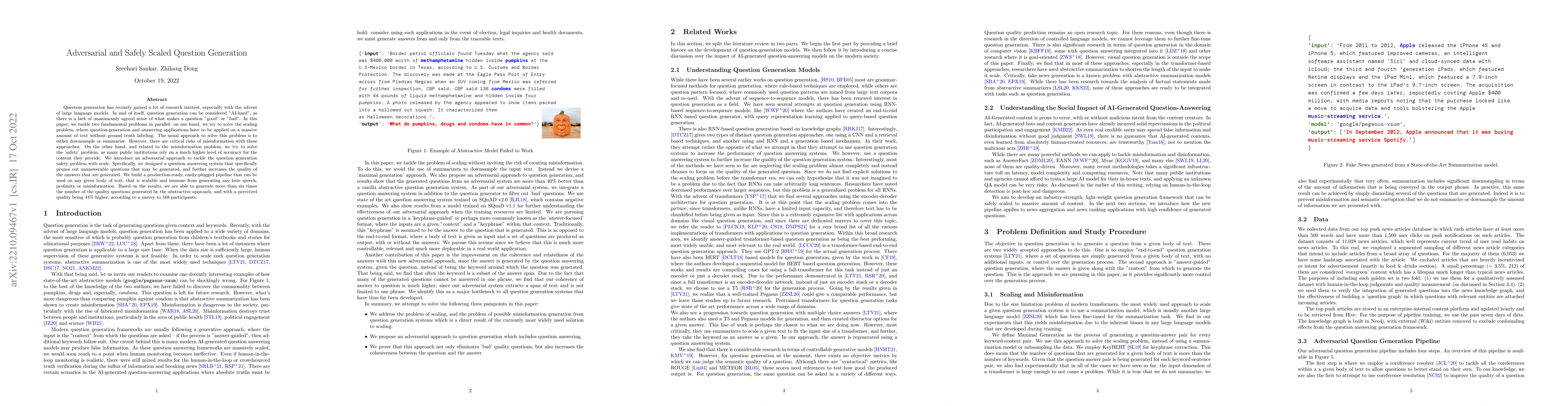 Question generation has recently gained a lot of research interest, especially with the advent of large language models. In and of itself, question generation can be considered 'AI-hard', as there is a lack of unanimously agreed sense of what makes a question 'good' or 'bad'. In this paper, we tackle two fundamental problems in parallel: on one hand, we try to solve the scaling problem, where question-generation and answering applications have to be applied to a massive amount of text without ground truth labeling. The usual approach to solve this problem is to either downsample or summarize. However, there are critical risks of misinformation with these approaches. On the other hand, and related to the misinformation problem, we try to solve the 'safety' problem, as many public institutions rely on a much higher level of accuracy for the content they provide. We introduce an adversarial approach to tackle the question generation safety problem with scale. Specifically, we designed a question-answering system that specifically prunes out unanswerable questions that may be generated, and further increases the quality of the answers that are generated. We build a production-ready, easily-plugged pipeline that can be used on any given body of text, that is scalable and immune from generating any hate speech, profanity, or misinformation. Based on the results, we are able to generate more than six times the number of quality questions generated by the abstractive approach, with a perceived quality being 44% higher, according to a survey of 168 participants.