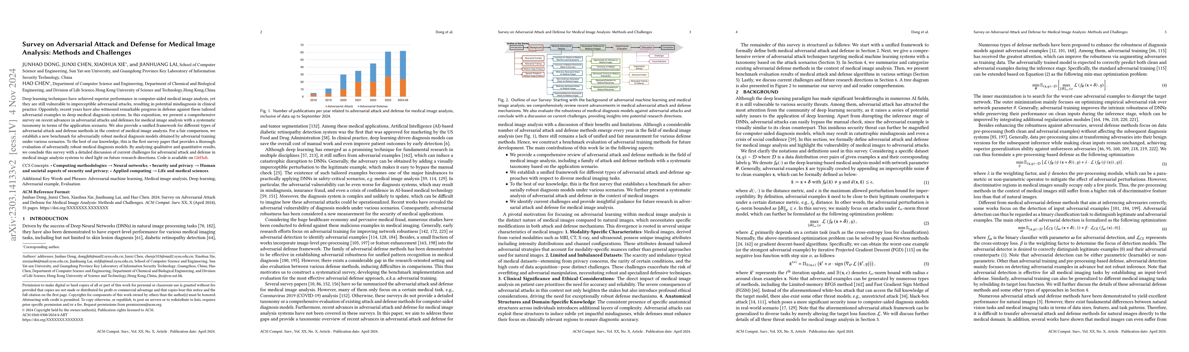 This paper surveys recent advances in adversarial attacks and defenses in medical image analysis, offering a novel taxonomy and theoretical framework. It establishes a new benchmark for evaluating robust models and discusses current challenges to guide future research.