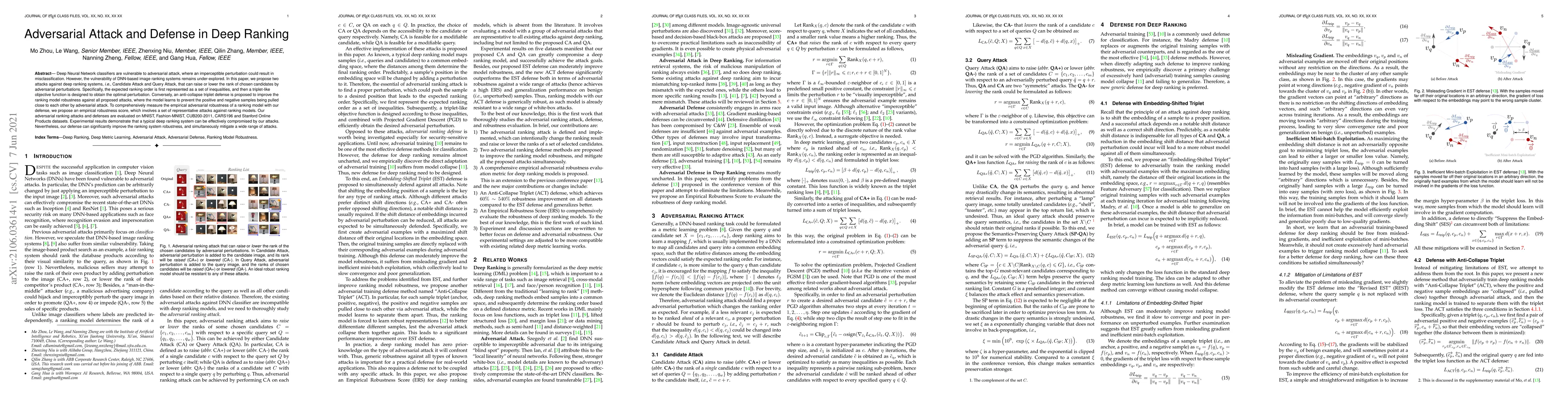 This paper proposes two novel adversarial attacks, Candidate Attack and Query Attack, against deep ranking systems to manipulate their rankings. It also introduces an anti-collapse triplet defense to enhance the robustness of ranking models against these attacks, evaluated on multiple datasets.