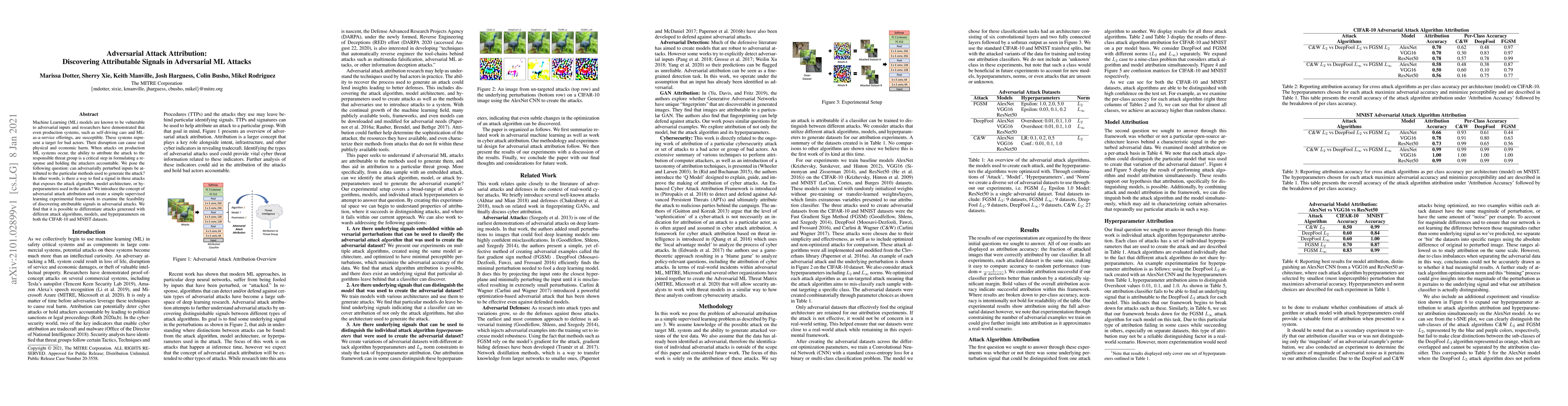 Machine Learning (ML) models are known to be vulnerable to adversarial inputs and researchers have demonstrated that even production systems, such as self-driving cars and ML-as-a-service offerings, are susceptible. These systems represent a target for bad actors. Their disruption can cause real physical and economic harm. When attacks on production ML systems occur, the ability to attribute the attack to the responsible threat group is a critical step in formulating a response and holding the attackers accountable. We pose the following question: can adversarially perturbed inputs be attributed to the particular methods used to generate the attack? In other words, is there a way to find a signal in these attacks that exposes the attack algorithm, model architecture, or hyperparameters used in the attack? We introduce the concept of adversarial attack attribution and create a simple supervised learning experimental framework to examine the feasibility of discovering attributable signals in adversarial attacks. We find that it is possible to differentiate attacks generated with different attack algorithms, models, and hyperparameters on both the CIFAR-10 and MNIST datasets.