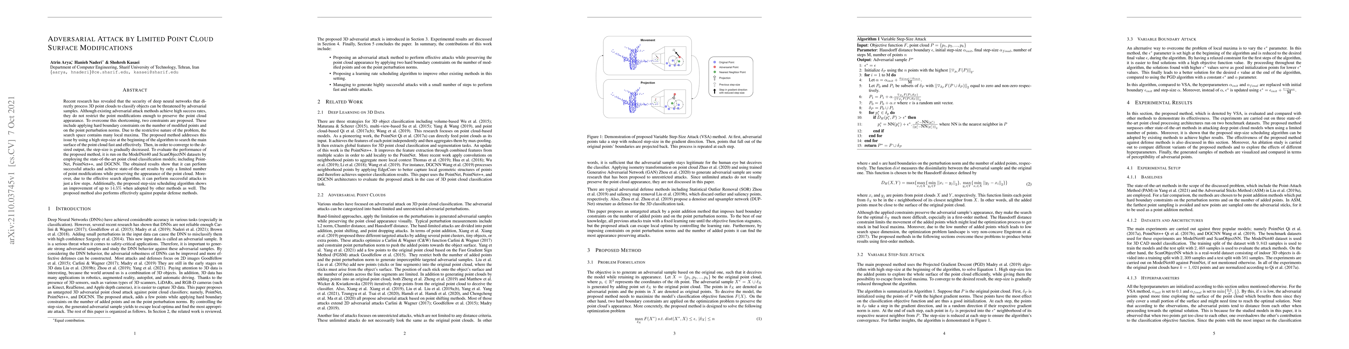 Recent research has revealed that the security of deep neural networks that directly process 3D point clouds to classify objects can be threatened by adversarial samples. Although existing adversarial attack methods achieve high success rates, they do not restrict the point modifications enough to preserve the point cloud appearance. To overcome this shortcoming, two constraints are proposed. These include applying hard boundary constraints on the number of modified points and on the point perturbation norms. Due to the restrictive nature of the problem, the search space contains many local maxima. The proposed method addresses this issue by using a high step-size at the beginning of the algorithm to search the main surface of the point cloud fast and effectively. Then, in order to converge to the desired output, the step-size is gradually decreased. To evaluate the performance of the proposed method, it is run on the ModelNet40 and ScanObjectNN datasets by employing the state-of-the-art point cloud classification models; including PointNet, PointNet++, and DGCNN. The obtained results show that it can perform successful attacks and achieve state-of-the-art results by only a limited number of point modifications while preserving the appearance of the point cloud. Moreover, due to the effective search algorithm, it can perform successful attacks in just a few steps. Additionally, the proposed step-size scheduling algorithm shows an improvement of up to $14.5\%$ when adopted by other methods as well. The proposed method also performs effectively against popular defense methods.
