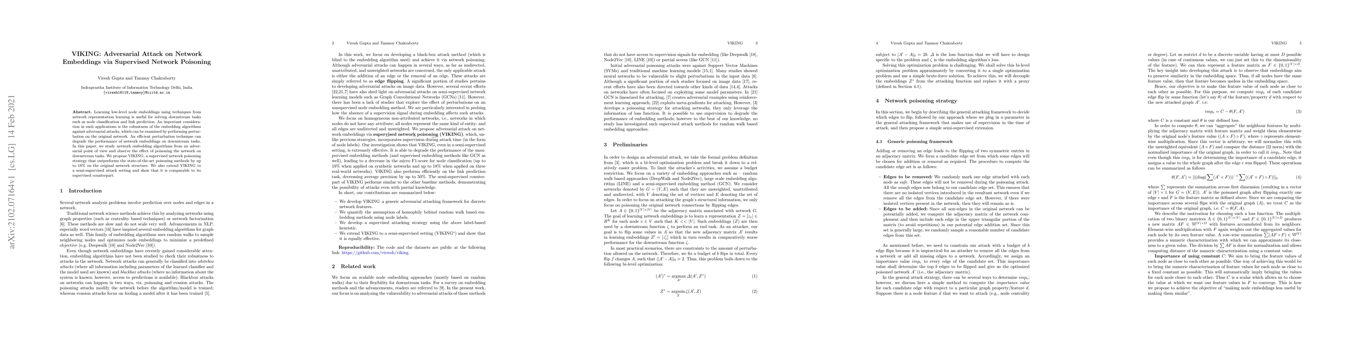 Learning low-level node embeddings using techniques from network representation learning is useful for solving downstream tasks such as node classification and link prediction. An important consideration in such applications is the robustness of the embedding algorithms against adversarial attacks, which can be examined by performing perturbation on the original network. An efficient perturbation technique can degrade the performance of network embeddings on downstream tasks. In this paper, we study network embedding algorithms from an adversarial point of view and observe the effect of poisoning the network on downstream tasks. We propose VIKING, a supervised network poisoning strategy that outperforms the state-of-the-art poisoning methods by upto 18% on the original network structure. We also extend VIKING to a semi-supervised attack setting and show that it is comparable to its supervised counterpart.