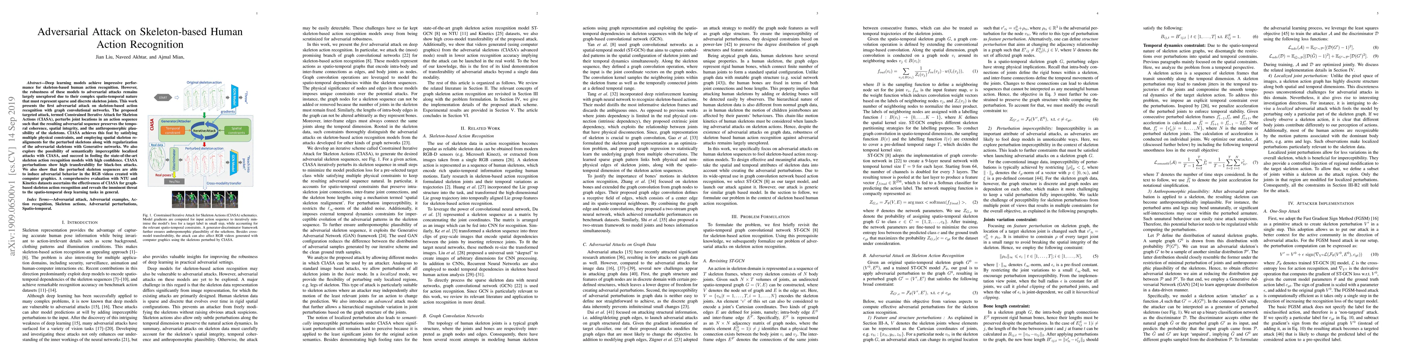 This paper introduces the first adversarial attack, CIASA, targeting skeleton-based human action recognition models using graph convolutional networks. CIASA perturbs skeleton joints while maintaining temporal coherence and spatial integrity, demonstrating high transferability and effectiveness across state-of-the-art models and datasets.