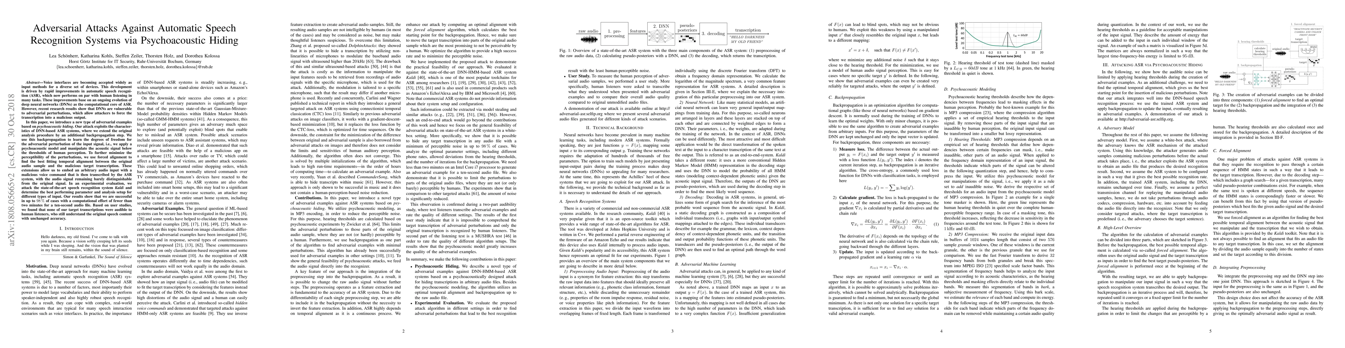 This paper introduces a novel adversarial attack method against DNN-based ASR systems using psychoacoustic hiding, embedding malicious commands inaudibly within audio signals. Experimental results show successful attacks on Kaldi in up to 98% of cases with minimal perceptibility.