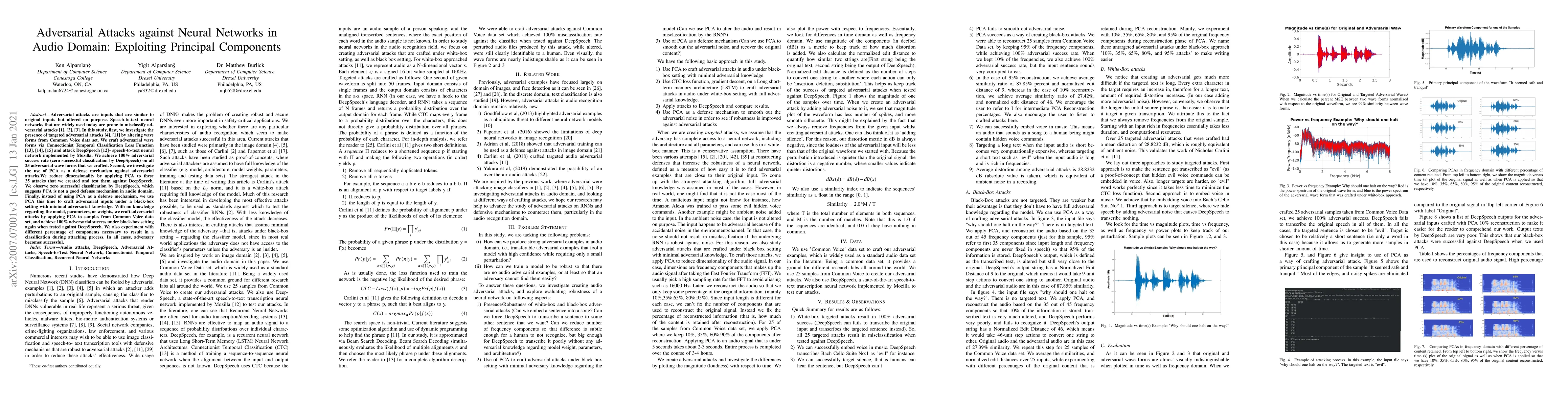 Adversarial attacks are inputs that are similar to original inputs but altered on purpose. Speech-to-text neural networks that are widely used today are prone to misclassify adversarial attacks. In this study, first, we investigate the presence of targeted adversarial attacks by altering wave forms from Common Voice data set. We craft adversarial wave forms via Connectionist Temporal Classification Loss Function, and attack DeepSpeech, a speech-to-text neural network implemented by Mozilla. We achieve 100% adversarial success rate (zero successful classification by DeepSpeech) on all 25 adversarial wave forms that we crafted. Second, we investigate the use of PCA as a defense mechanism against adversarial attacks. We reduce dimensionality by applying PCA to these 25 attacks that we created and test them against DeepSpeech. We observe zero successful classification by DeepSpeech, which suggests PCA is not a good defense mechanism in audio domain. Finally, instead of using PCA as a defense mechanism, we use PCA this time to craft adversarial inputs under a black-box setting with minimal adversarial knowledge. With no knowledge regarding the model, parameters, or weights, we craft adversarial attacks by applying PCA to samples from Common Voice data set and achieve 100% adversarial success under black-box setting again when tested against DeepSpeech. We also experiment with different percentage of components necessary to result in a classification during attacking process. In all cases, adversary becomes successful.
