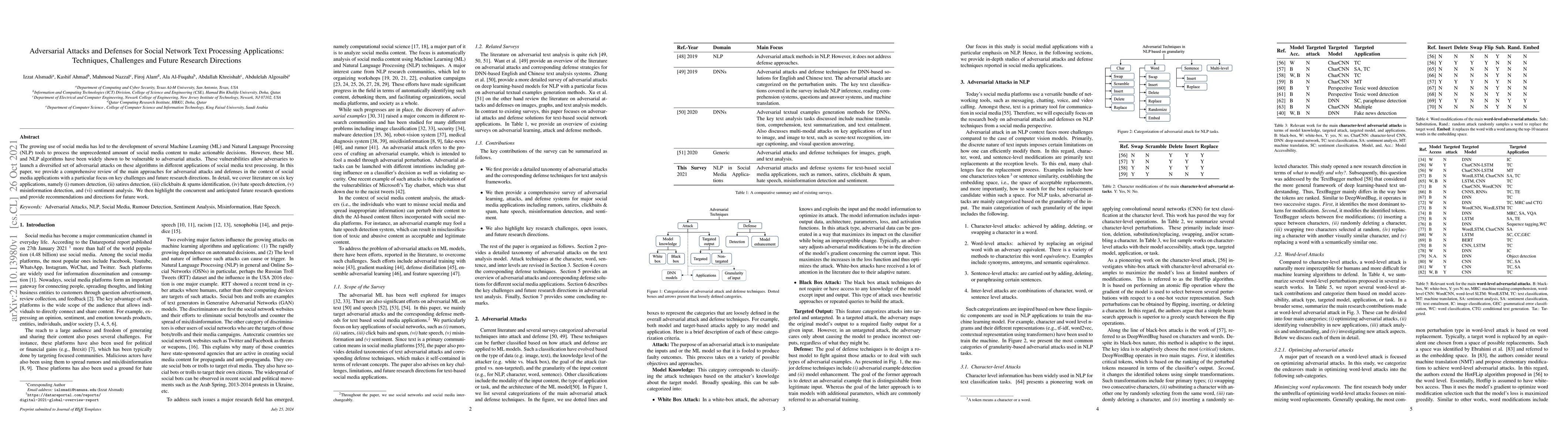 The growing use of social media has led to the development of several Machine Learning (ML) and Natural Language Processing(NLP) tools to process the unprecedented amount of social media content to make actionable decisions. However, these MLand NLP algorithms have been widely shown to be vulnerable to adversarial attacks. These vulnerabilities allow adversaries to launch a diversified set of adversarial attacks on these algorithms in different applications of social media text processing. In this paper, we provide a comprehensive review of the main approaches for adversarial attacks and defenses in the context of social media applications with a particular focus on key challenges and future research directions. In detail, we cover literature on six key applications, namely (i) rumors detection, (ii) satires detection, (iii) clickbait & spams identification, (iv) hate speech detection, (v)misinformation detection, and (vi) sentiment analysis. We then highlight the concurrent and anticipated future research questions and provide recommendations and directions for future work.