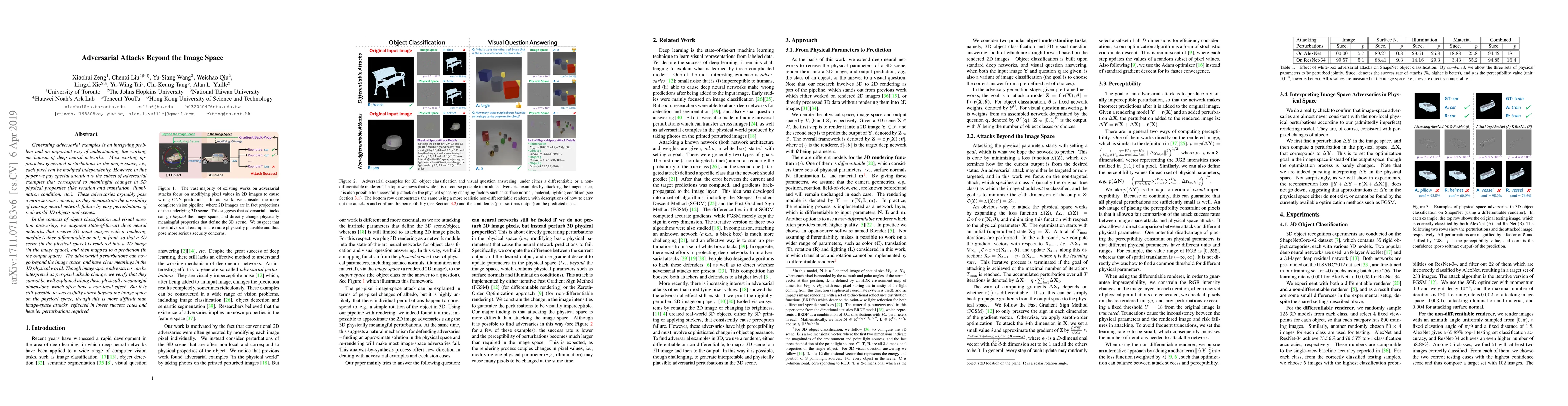 Generating adversarial examples is an intriguing problem and an important way of understanding the working mechanism of deep neural networks. Most existing approaches generated perturbations in the image space, i.e., each pixel can be modified independently. However, in this paper we pay special attention to the subset of adversarial examples that correspond to meaningful changes in 3D physical properties (like rotation and translation, illumination condition, etc.). These adversaries arguably pose a more serious concern, as they demonstrate the possibility of causing neural network failure by easy perturbations of real-world 3D objects and scenes. In the contexts of object classification and visual question answering, we augment state-of-the-art deep neural networks that receive 2D input images with a rendering module (either differentiable or not) in front, so that a 3D scene (in the physical space) is rendered into a 2D image (in the image space), and then mapped to a prediction (in the output space). The adversarial perturbations can now go beyond the image space, and have clear meanings in the 3D physical world. Though image-space adversaries can be interpreted as per-pixel albedo change, we verify that they cannot be well explained along these physically meaningful dimensions, which often have a non-local effect. But it is still possible to successfully attack beyond the image space on the physical space, though this is more difficult than image-space attacks, reflected in lower success rates and heavier perturbations required.
