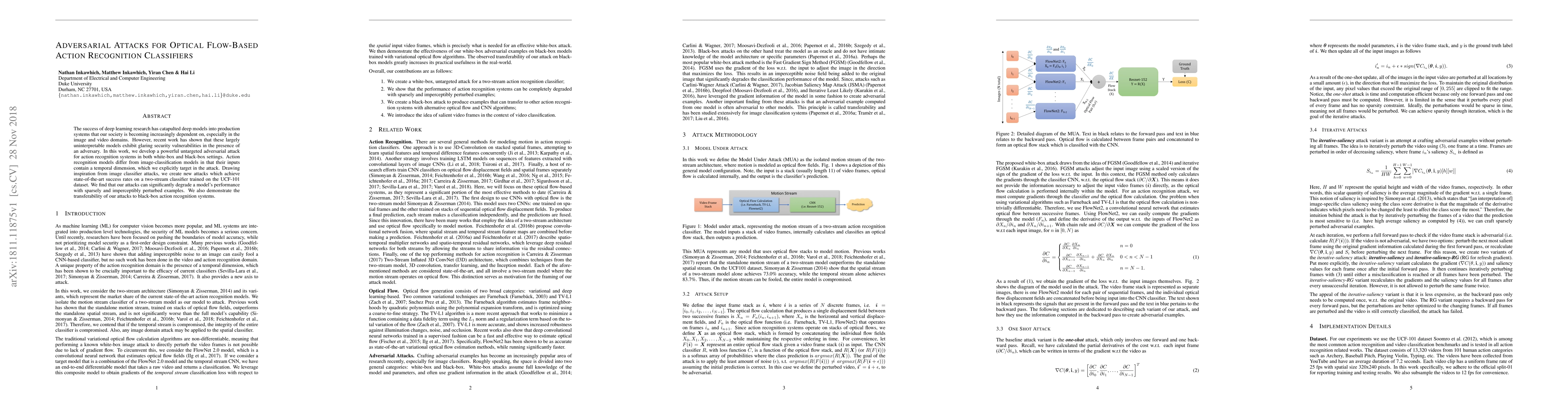 This paper develops a powerful untargeted adversarial attack targeting optical flow-based action recognition systems, achieving state-of-the-art performance on UCF-101. The attack exploits the temporal dimension of action recognition inputs, demonstrating significant model degradation with minimal perturbations.