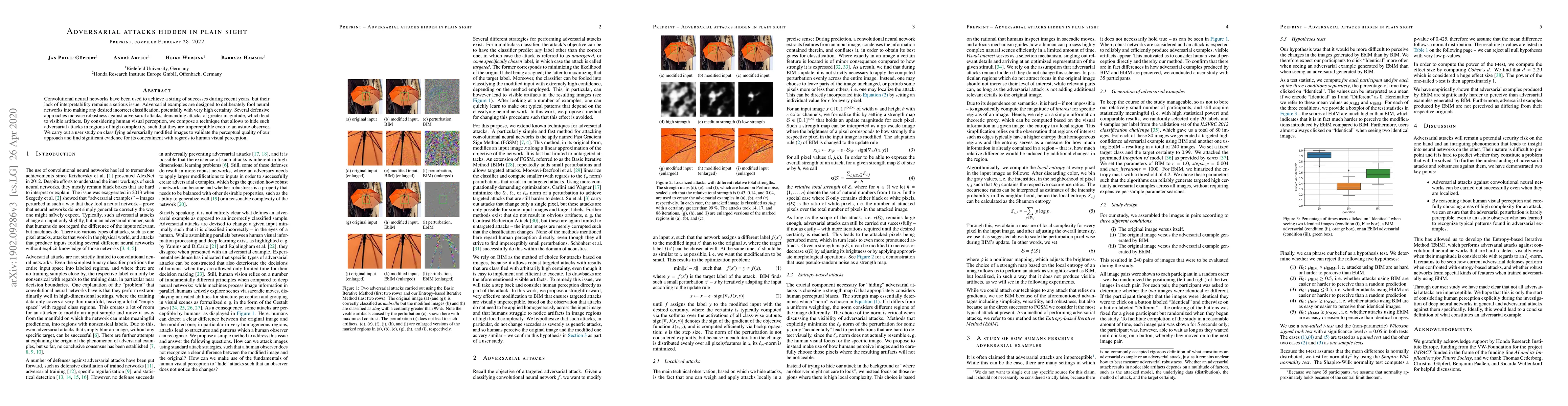 Convolutional neural networks have been used to achieve a string of successes during recent years, but their lack of interpretability remains a serious issue. Adversarial examples are designed to deliberately fool neural networks into making any desired incorrect classification, potentially with very high certainty. Several defensive approaches increase robustness against adversarial attacks, demanding attacks of greater magnitude, which lead to visible artifacts. By considering human visual perception, we compose a technique that allows to hide such adversarial attacks in regions of high complexity, such that they are imperceptible even to an astute observer. We carry out a user study on classifying adversarially modified images to validate the perceptual quality of our approach and find significant evidence for its concealment with regards to human visual perception.