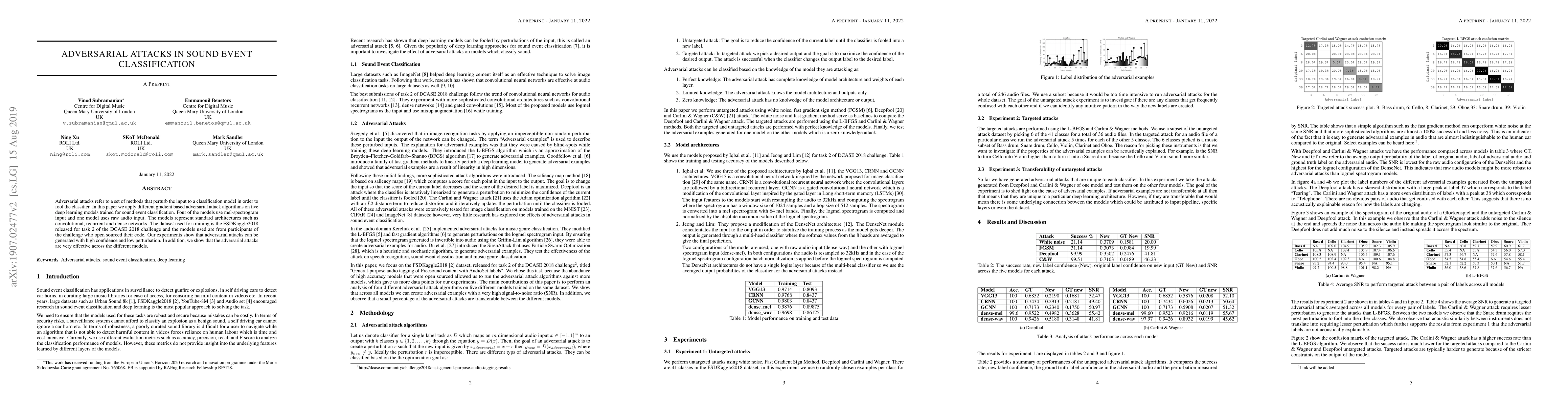 Researchers found that adversarial attacks can effectively fool sound event classification models, even with minimal perturbation, using various deep learning architectures.