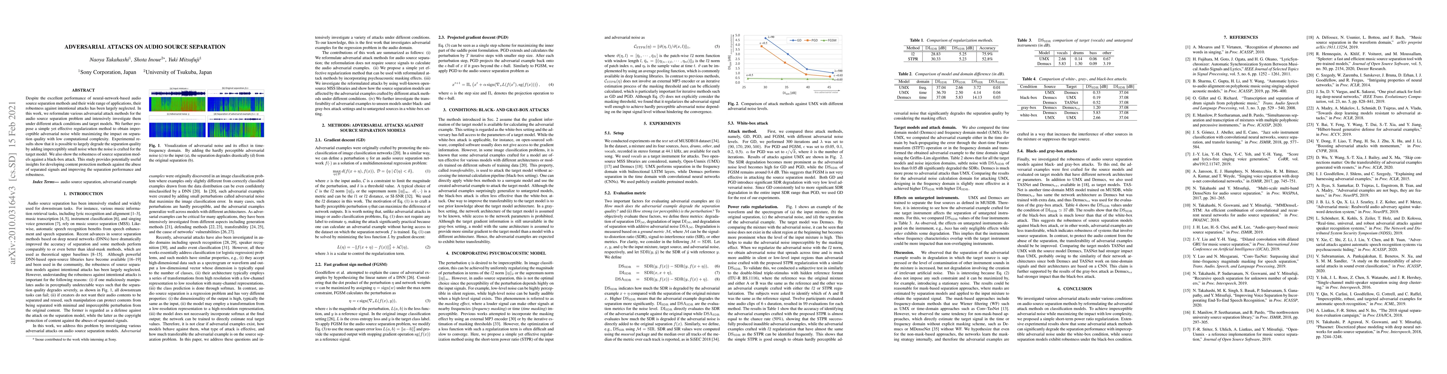 This paper investigates adversarial attacks on neural-network-based audio source separation methods, demonstrating that imperceptible noise can significantly degrade separation quality when tailored for specific models. The authors propose a regularization method to generate such noise efficiently and discuss the robustness of models against black-box attacks, offering insights for enhancing separation performance and security.