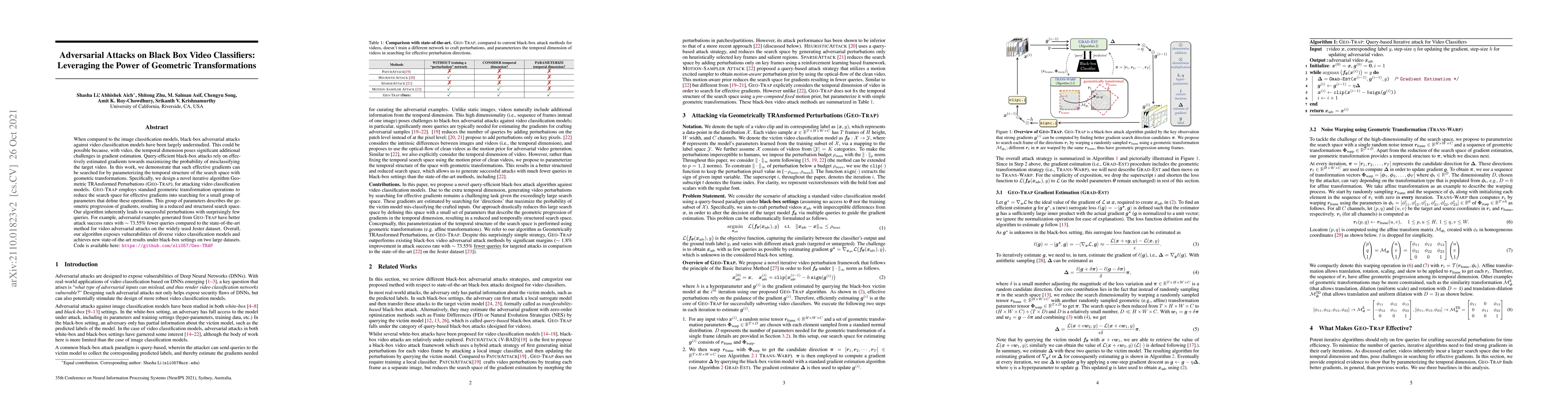 This paper introduces GEO-TRAP, a novel iterative algorithm for black-box adversarial attacks on video classifiers by leveraging geometric transformations to reduce the search space for effective gradients. The method achieves state-of-the-art results with significantly fewer queries compared to existing methods.