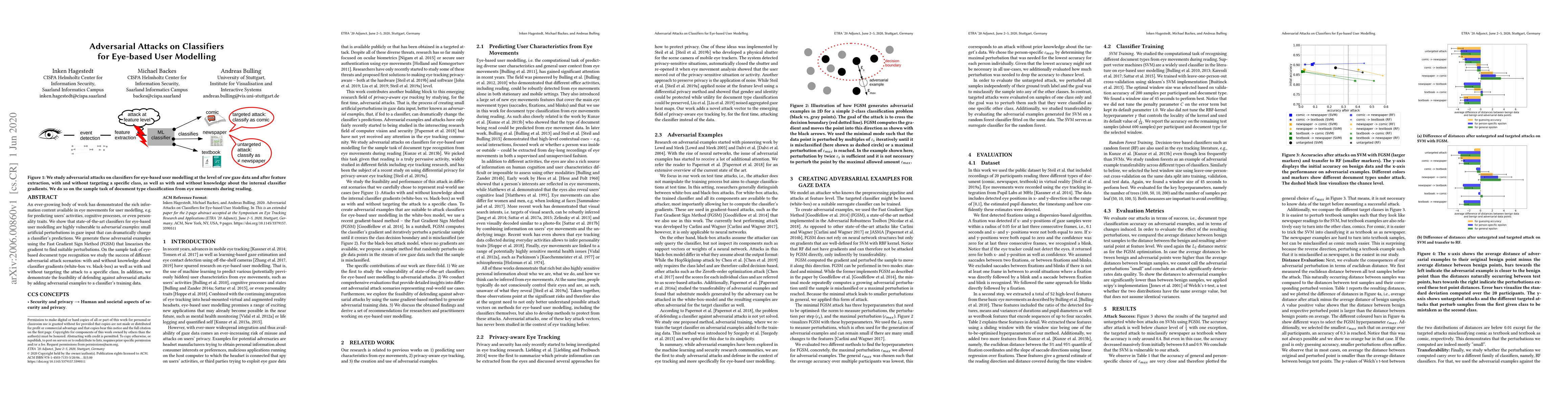 This paper investigates the vulnerability of classifiers used for eye-based user modelling to adversarial attacks, demonstrating that small perturbations in gaze input can significantly alter predictions. The study employs the Fast Gradient Sign Method to generate adversarial examples and explores attack strategies in both white-box and black-box scenarios. Additionally, it proposes a defense mechanism by incorporating adversarial examples into training data.