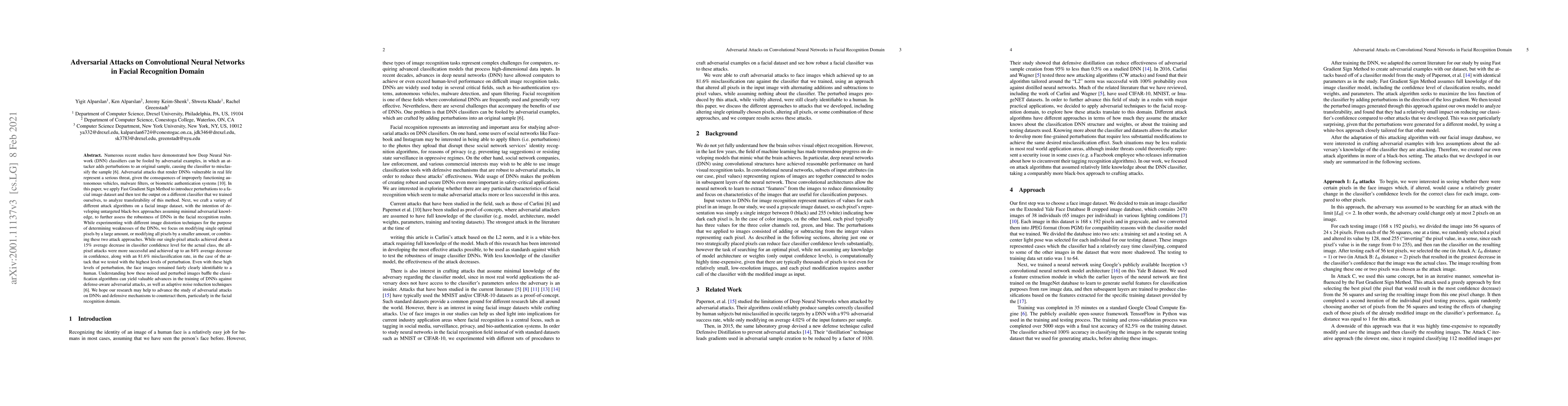 This paper explores adversarial attacks on convolutional neural networks used in facial recognition, employing the Fast Gradient Sign Method and various black-box attack techniques. The study reveals significant vulnerabilities, with all-pixel attacks achieving up to an 84% decrease in confidence and an 81.6% misclassification rate, highlighting the potential for improved defensive strategies against such attacks.