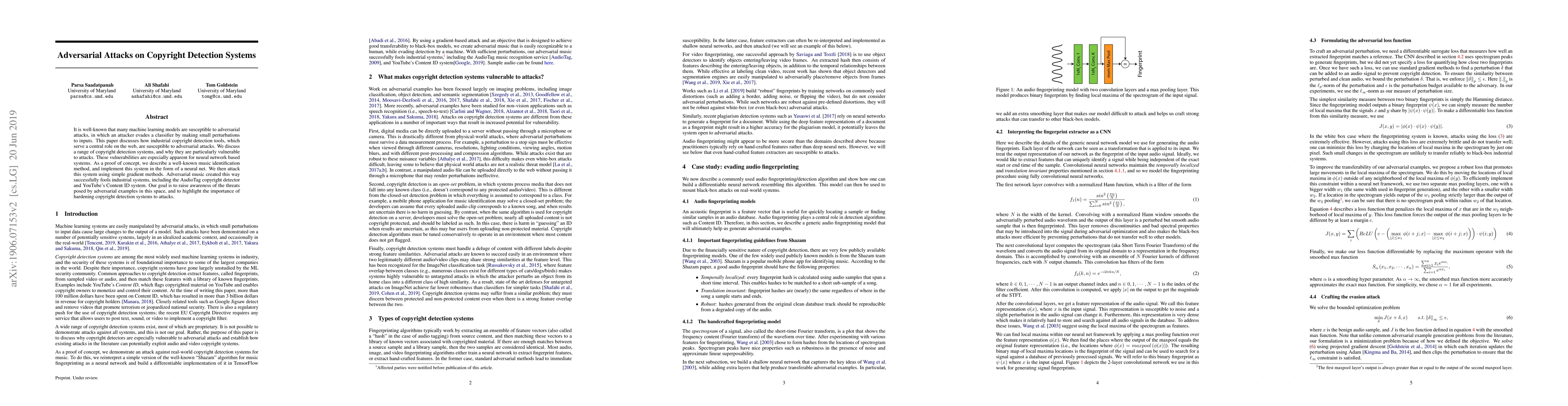 This paper explores the susceptibility of industrial copyright detection systems, particularly neural networks, to adversarial attacks. It demonstrates how small perturbations can fool systems like AudioTag and YouTube's Content ID, highlighting the need for robust defenses against such threats.