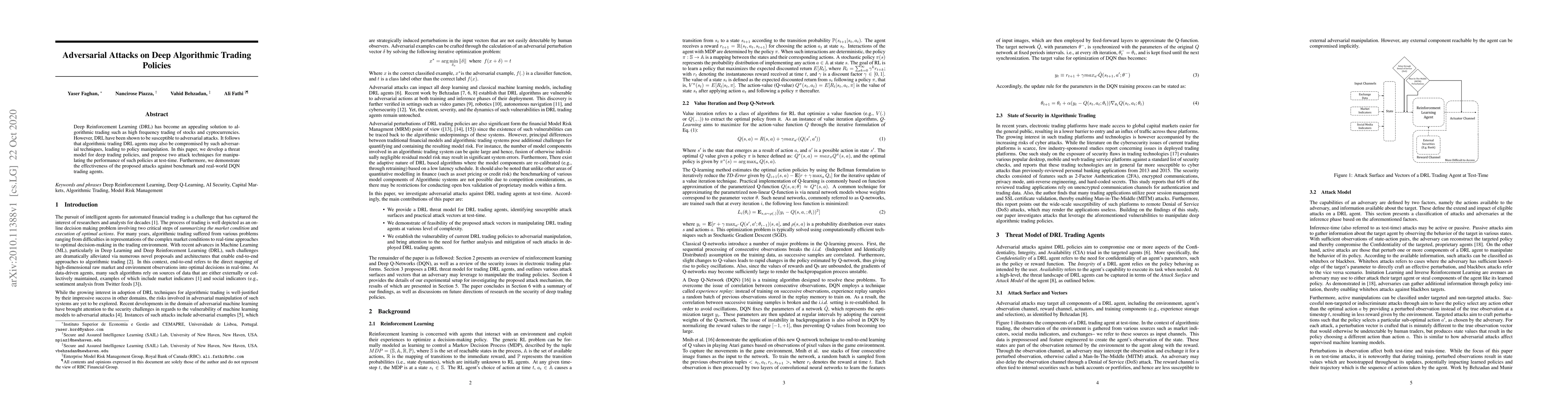 This paper explores the vulnerability of deep reinforcement learning (DRL) algorithms used in algorithmic trading to adversarial attacks, proposing two attack techniques to manipulate trading performance. It demonstrates the effectiveness of these attacks on both benchmark and real-world DQN trading agents.