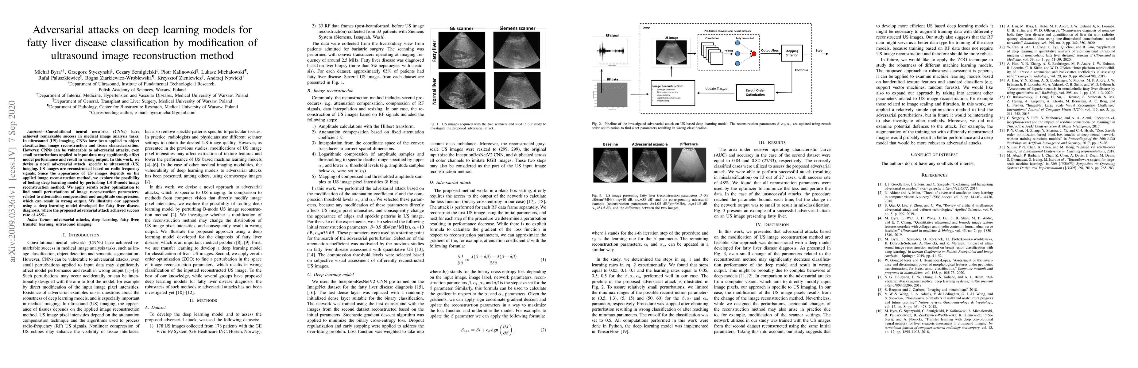 This paper explores adversarial attacks on deep learning models used for fatty liver disease classification via ultrasound imaging. The authors propose a novel attack method that perturbs the ultrasound image reconstruction parameters, achieving a 48% success rate in fooling the model.