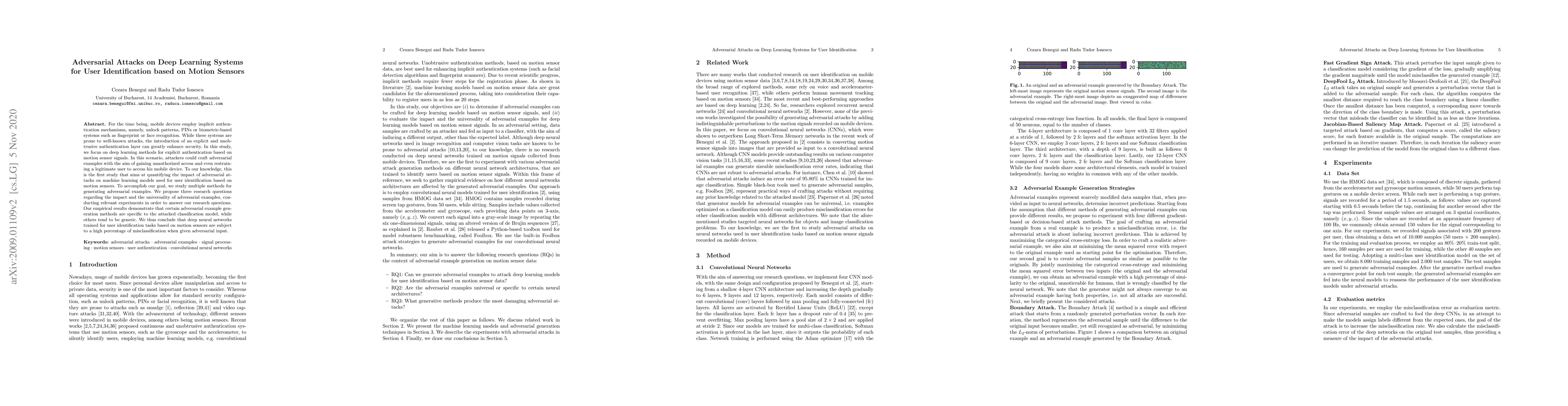 This paper investigates the vulnerability of deep learning models used for user identification via motion sensors to adversarial attacks. It finds that while some attack methods are model-specific, others are universal, leading to high misclassification rates and thus posing significant security risks for mobile device authentication.
