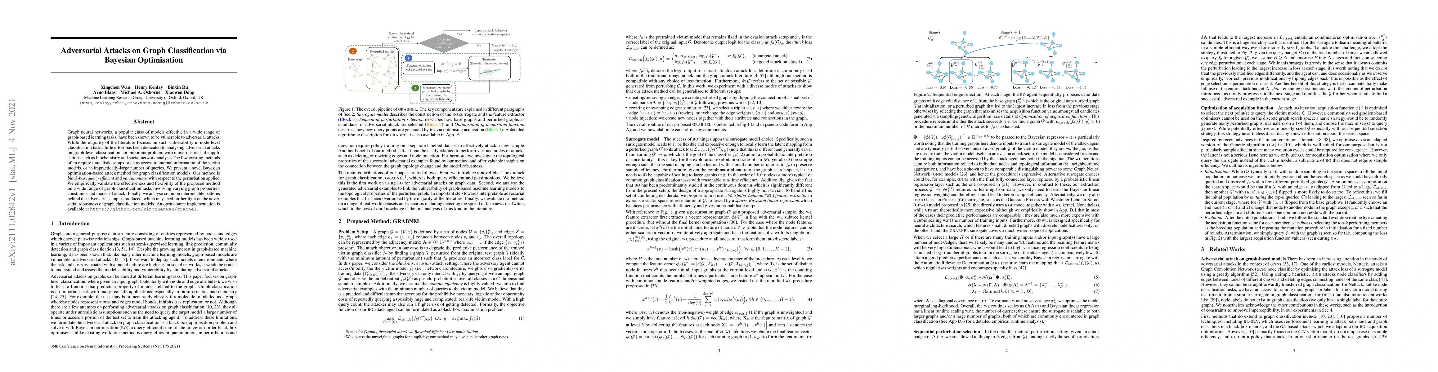 This paper introduces a novel Bayesian optimisation-based attack method for graph classification models, focusing on black-box, query-efficient, and minimal perturbation strategies. The proposed method is validated across various graph classification tasks, highlighting its effectiveness and flexibility.