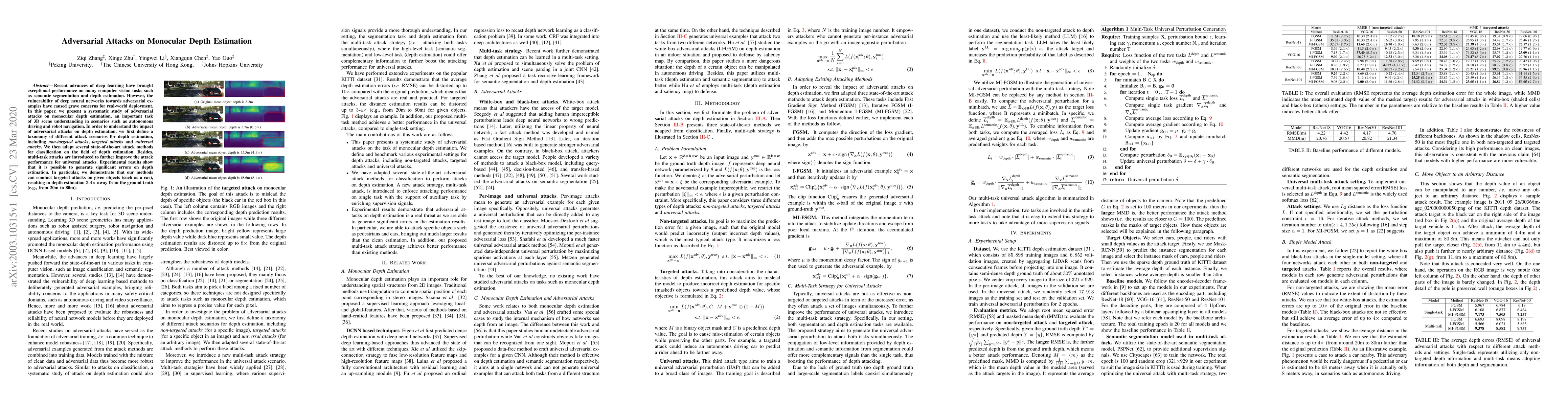 This paper investigates adversarial attacks on monocular depth estimation, defining various attack scenarios and adapting state-of-the-art attack methods. Experimental results show significant errors in depth estimation, including targeted attacks on specific objects causing substantial deviations from ground truth measurements.