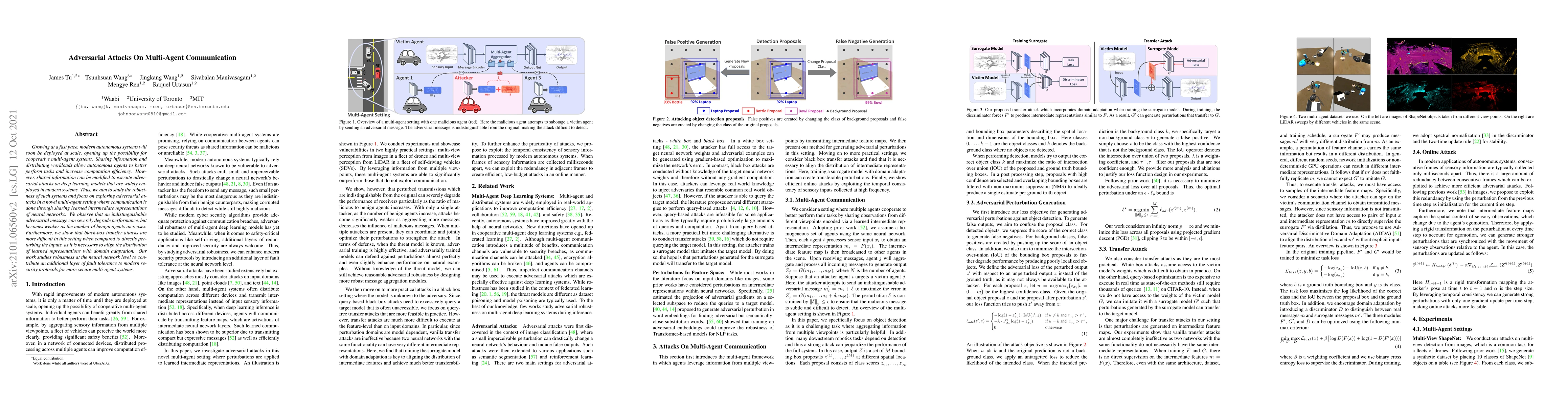 The research investigates adversarial attacks on communication in multi-agent deep learning systems, focusing on two practical settings: multi-view detection from images for drones and vehicle-to-vehicle (V2V) communication for self-driving cars. Experiments involve synthetic datasets, synthetic LiDAR sweeps, and real-world LiDAR data. Adversarial attacks are designed to exploit intermediate feature representations shared among agents.
