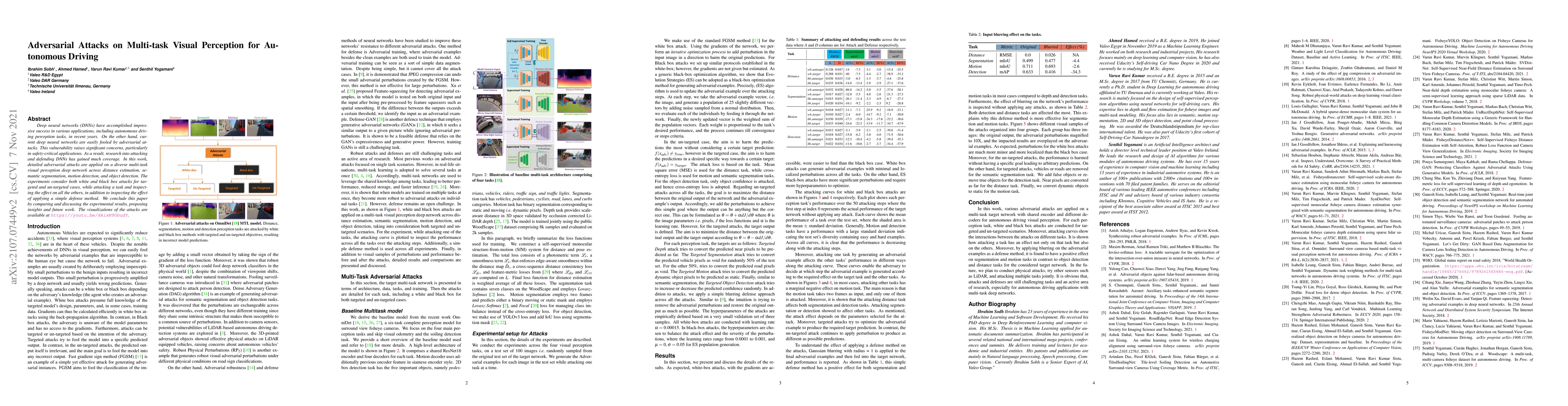 This paper investigates adversarial attacks on a multi-task visual perception network for autonomous driving, focusing on distance estimation, semantic segmentation, motion detection, and object detection. It examines both white and black box attacks for targeted and untargeted scenarios, and analyzes their effects on each task while implementing a simple defense method.