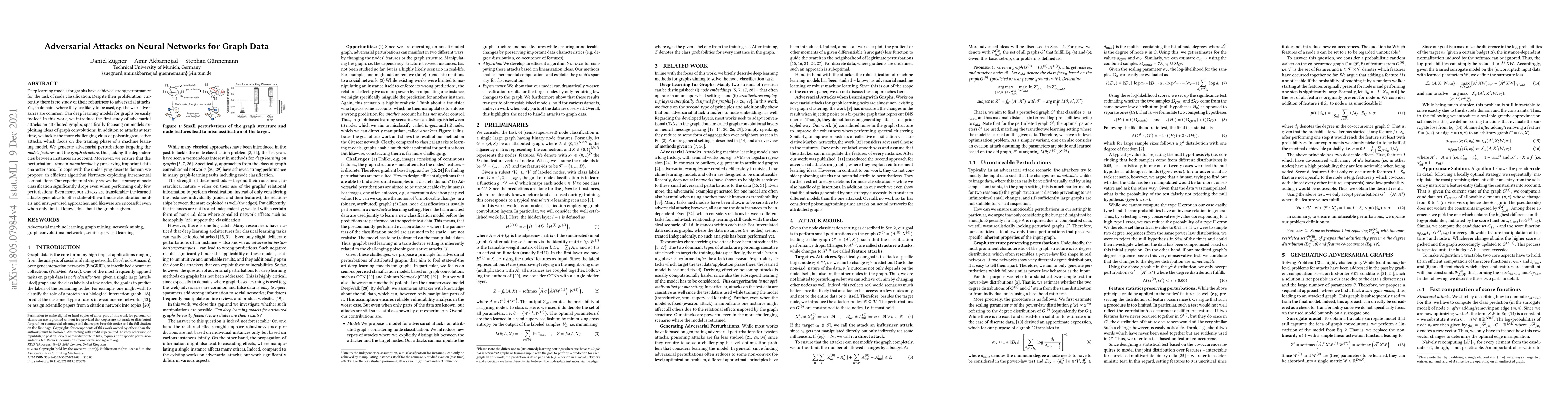 This paper investigates the vulnerability of deep learning models for graph data to adversarial attacks, focusing on both test-time and poisoning attacks. The study reveals that even minimal adversarial perturbations can significantly degrade model performance, demonstrating the transferability of the attacks across different models and limited knowledge scenarios.