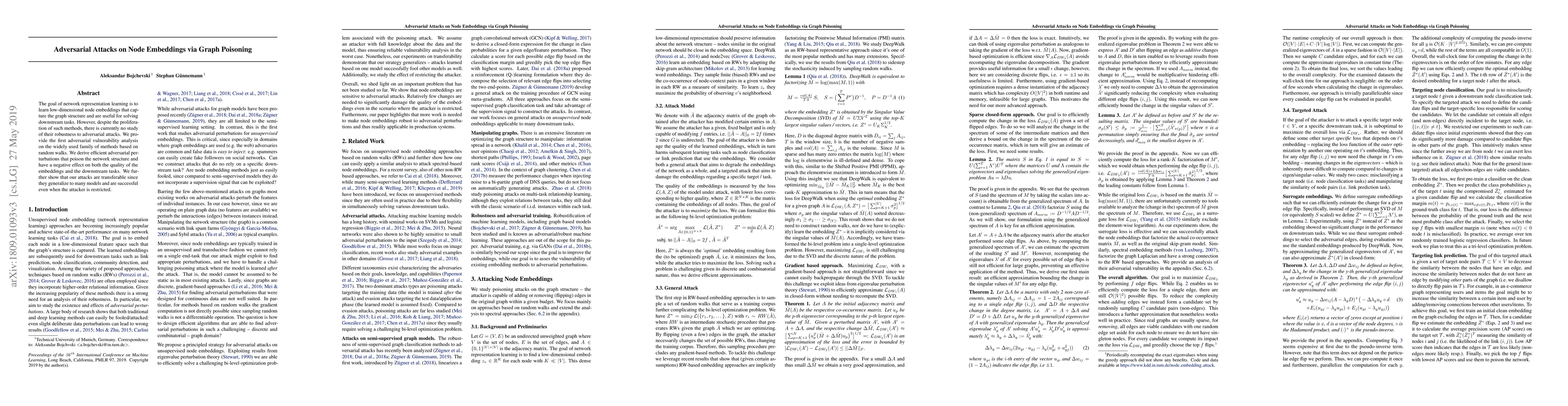 This paper investigates the vulnerability of node embedding methods based on random walks to adversarial attacks, demonstrating efficient graph poisoning techniques that degrade both embedding quality and downstream task performance. The attacks are shown to be transferable across various models, even under restricted attacker conditions.