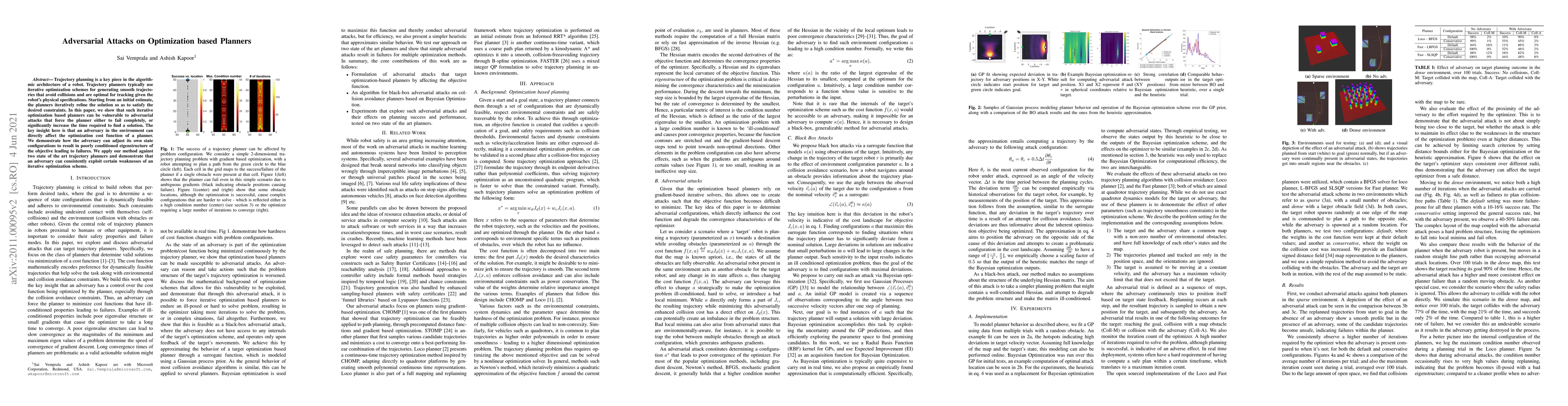 Trajectory planning is a key piece in the algorithmic architecture of a robot. Trajectory planners typically use iterative optimization schemes for generating smooth trajectories that avoid collisions and are optimal for tracking given the robot's physical specifications. Starting from an initial estimate, the planners iteratively refine the solution so as to satisfy the desired constraints. In this paper, we show that such iterative optimization based planners can be vulnerable to adversarial attacks that force the planner either to fail completely, or significantly increase the time required to find a solution. The key insight here is that an adversary in the environment can directly affect the optimization cost function of a planner. We demonstrate how the adversary can adjust its own state configurations to result in poorly conditioned eigenstructure of the objective leading to failures. We apply our method against two state of the art trajectory planners and demonstrate that an adversary can consistently exploit certain weaknesses of an iterative optimization scheme.