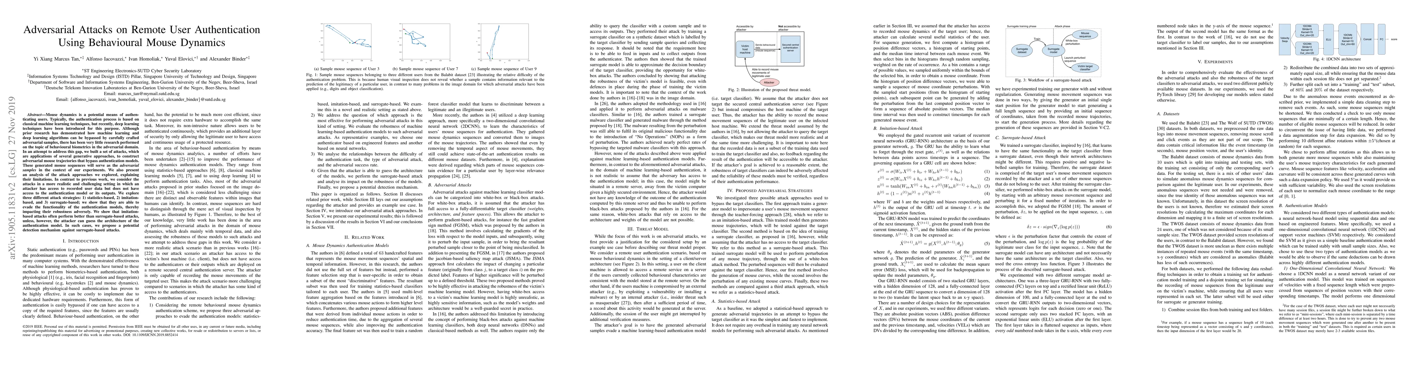 This paper investigates adversarial attacks on remote user authentication systems based on mouse dynamics, employing deep learning techniques. It develops and analyzes three attack strategies—statistics-based, imitation-based, and surrogate-based—demonstrating their ability to bypass authentication models, with imitation-based attacks generally proving more effective unless the attacker can infer the model's architecture.