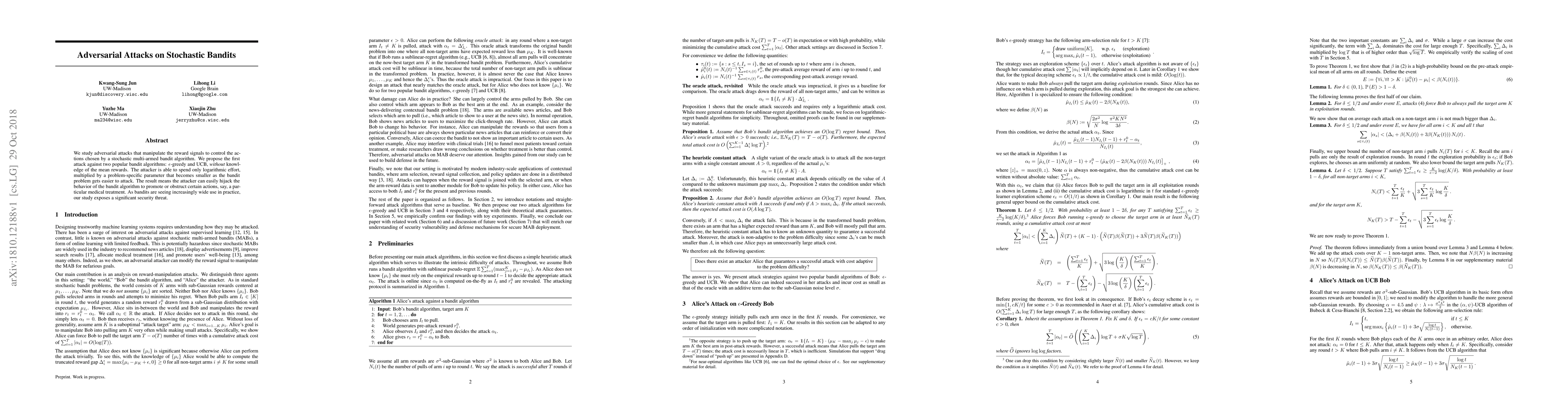 This paper explores adversarial attacks on stochastic multi-armed bandit algorithms, proposing the first attack against $\epsilon$-greedy and UCB algorithms without prior knowledge of mean rewards. The attacker can manipulate reward signals with minimal effort, posing a significant security threat as bandit algorithms gain wider practical use.