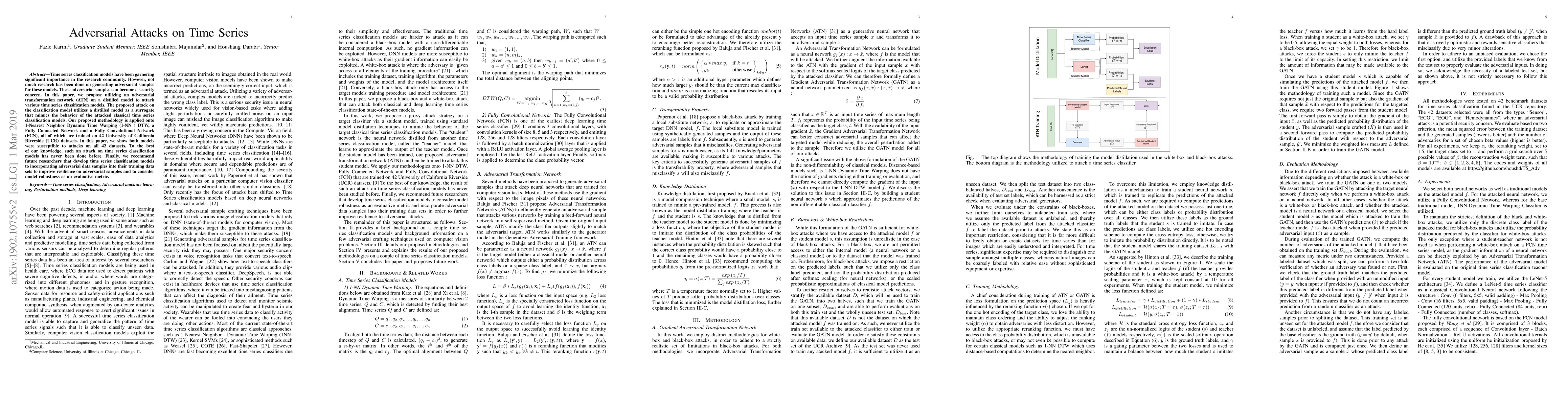 The paper proposes an adversarial transformation network (ATN) utilizing a distilled model to attack time series classification models. The method is applied on 1-NN DTW, Fully Connected Network (FCN), and Fully Convolutional Network (FCN) trained on 42 UCR datasets.