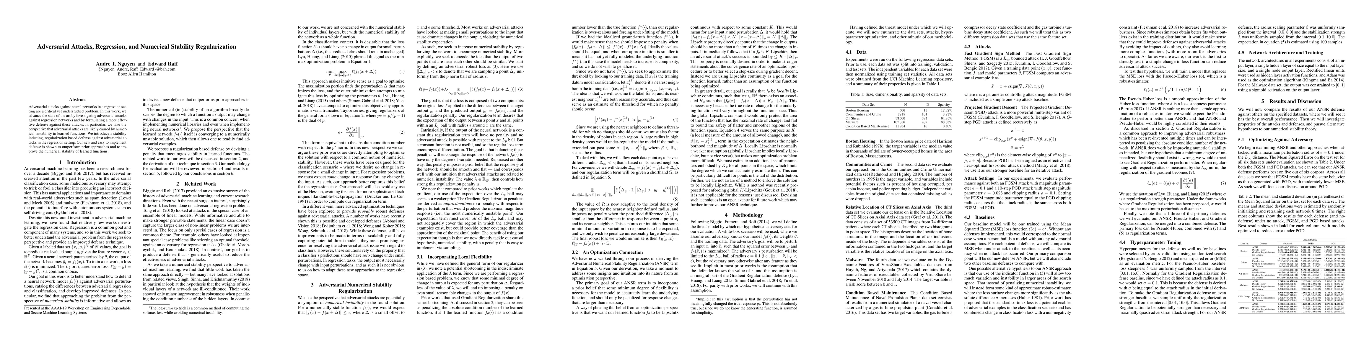 This paper explores adversarial attacks on neural networks in regression tasks and proposes a regularization-based defense strategy to enhance numerical stability, demonstrating superior performance compared to existing methods.