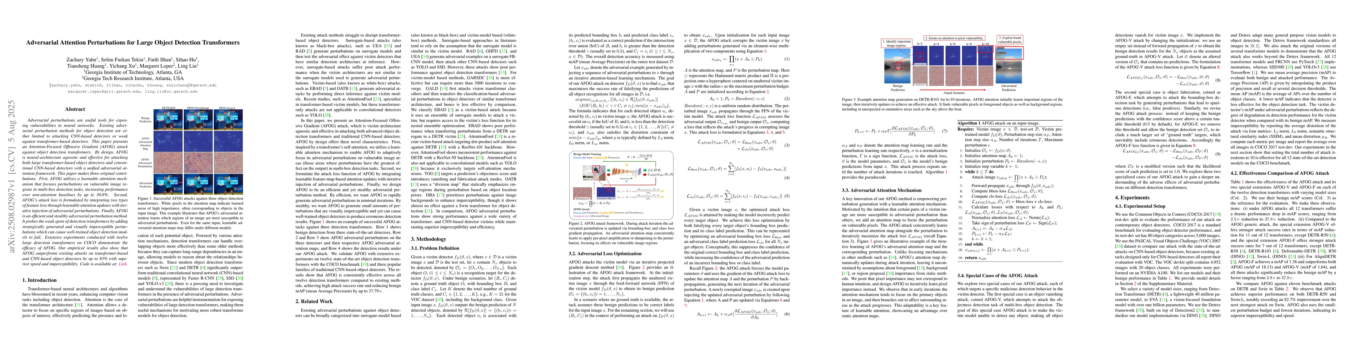 Adversarial perturbations are useful tools for exposing vulnerabilities in neural networks. Existing adversarial perturbation methods for object detection are either limited to attacking CNN-based detectors or weak against transformer-based detectors. This paper presents an Attention-Focused Offensive Gradient (AFOG) attack against object detection transformers. By design, AFOG is neural-architecture agnostic and effective for attacking both large transformer-based object detectors and conventional CNN-based detectors with a unified adversarial attention framework. This paper makes three original contributions. First, AFOG utilizes a learnable attention mechanism that focuses perturbations on vulnerable image regions in multi-box detection tasks, increasing performance over non-attention baselines by up to 30.6%. Second, AFOG's attack loss is formulated by integrating two types of feature loss through learnable attention updates with iterative injection of adversarial perturbations. Finally, AFOG is an efficient and stealthy adversarial perturbation method. It probes the weak spots of detection transformers by adding strategically generated and visually imperceptible perturbations which can cause well-trained object detection models to fail. Extensive experiments conducted with twelve large detection transformers on COCO demonstrate the efficacy of AFOG. Our empirical results also show that AFOG outperforms existing attacks on transformer-based and CNN-based object detectors by up to 83% with superior speed and imperceptibility. Code is available at https://github.com/zacharyyahn/AFOG.