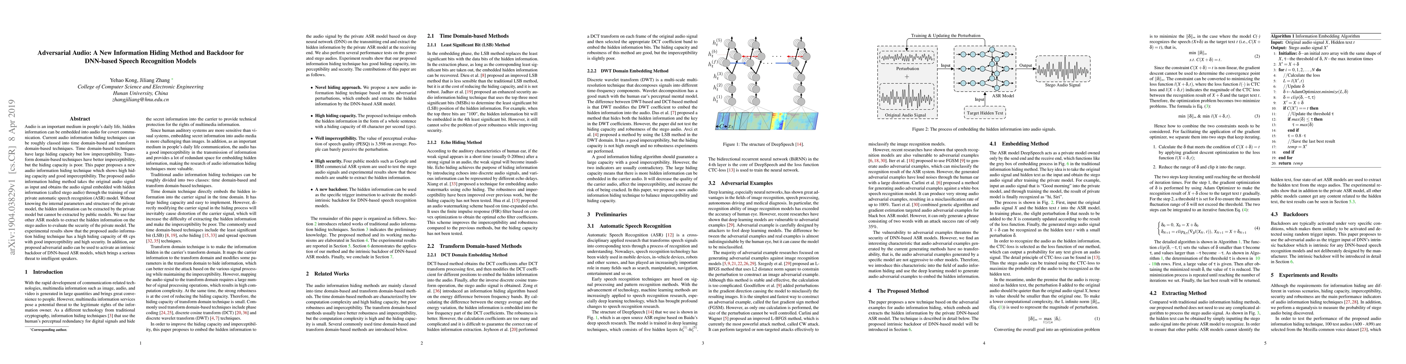 This paper introduces a novel audio information hiding method that combines high hiding capacity with good imperceptibility by training a private automatic speech recognition model. The hidden information remains secure against extraction by public models, demonstrating a high capacity of 48 cps and potential to exploit backdoors in DNN-based speech recognition systems.