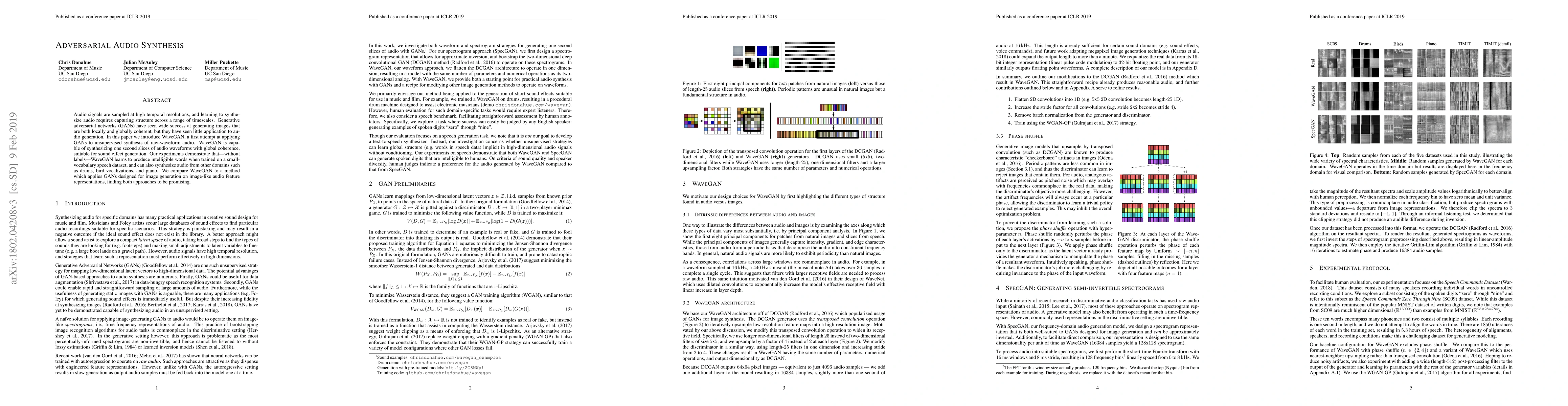 This paper introduces WaveGAN, a generative adversarial network (GAN) for unsupervised synthesis of raw-waveform audio, demonstrating the ability to generate coherent one-second audio clips suitable for sound effects. WaveGAN successfully produces intelligible words and various audio types without labels, showcasing its potential in diverse audio domains.