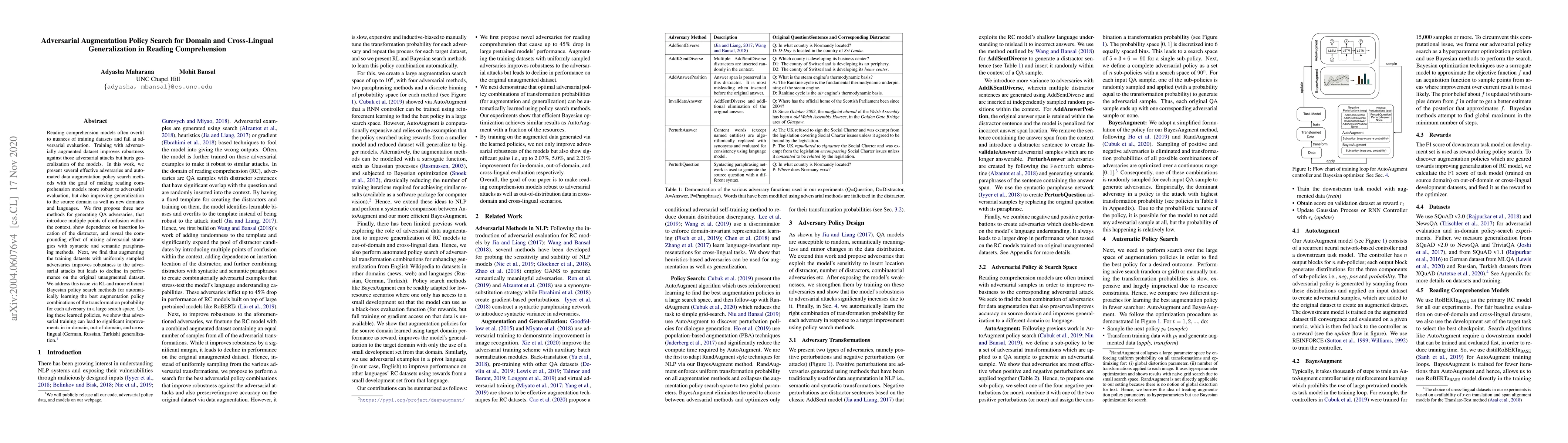 This paper proposes methods for generating adversarial examples to improve the robustness of reading comprehension models against adversarial attacks while also enhancing their generalization to new domains and languages. It employs reinforcement learning and Bayesian policy search to determine optimal augmentation strategies, demonstrating improved performance across various languages and domains.