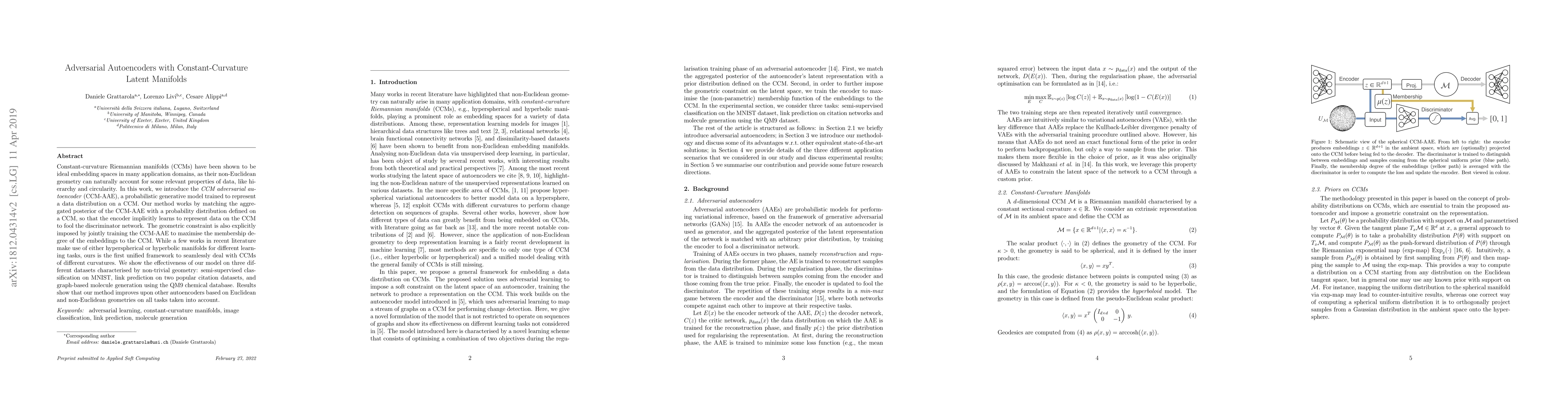 Constant-curvature Riemannian manifolds (CCMs) have been shown to be ideal embedding spaces in many application domains, as their non-Euclidean geometry can naturally account for some relevant properties of data, like hierarchy and circularity. In this work, we introduce the CCM adversarial autoencoder (CCM-AAE), a probabilistic generative model trained to represent a data distribution on a CCM. Our method works by matching the aggregated posterior of the CCM-AAE with a probability distribution defined on a CCM, so that the encoder implicitly learns to represent data on the CCM to fool the discriminator network. The geometric constraint is also explicitly imposed by jointly training the CCM-AAE to maximise the membership degree of the embeddings to the CCM. While a few works in recent literature make use of either hyperspherical or hyperbolic manifolds for different learning tasks, ours is the first unified framework to seamlessly deal with CCMs of different curvatures. We show the effectiveness of our model on three different datasets characterised by non-trivial geometry: semi-supervised classification on MNIST, link prediction on two popular citation datasets, and graph-based molecule generation using the QM9 chemical database. Results show that our method improves upon other autoencoders based on Euclidean and non-Euclidean geometries on all tasks taken into account.