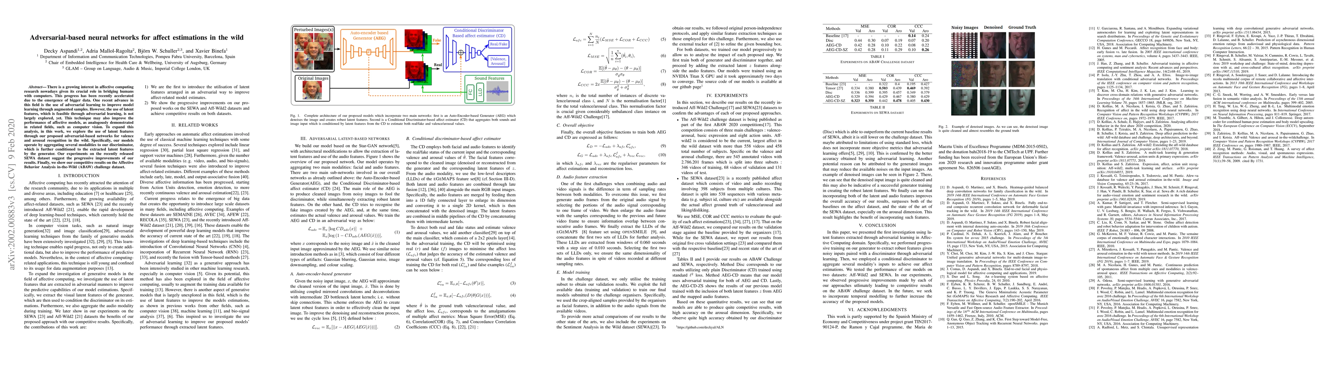 There is a growing interest in affective computing research nowadays given its crucial role in bridging humans with computers. This progress has been recently accelerated due to the emergence of bigger data. One recent advance in this field is the use of adversarial learning to improve model learning through augmented samples. However, the use of latent features, which is feasible through adversarial learning, is not largely explored, yet. This technique may also improve the performance of affective models, as analogously demonstrated in related fields, such as computer vision. To expand this analysis, in this work, we explore the use of latent features through our proposed adversarial-based networks for valence and arousal recognition in the wild. Specifically, our models operate by aggregating several modalities to our discriminator, which is further conditioned to the extracted latent features by the generator. Our experiments on the recently released SEWA dataset suggest the progressive improvements of our results. Finally, we show our competitive results on the Affective Behavior Analysis in-the-Wild (ABAW) challenge dataset
