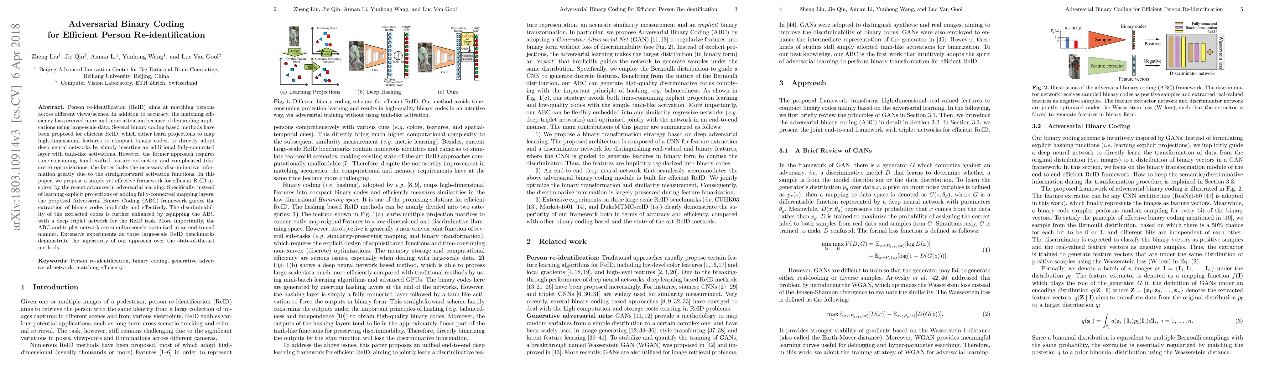 This paper proposes a novel approach to person re-identification called Adversarial Binary Coding, which combines implicit feature extraction with a deep triplet network for efficient matching in large-scale datasets.