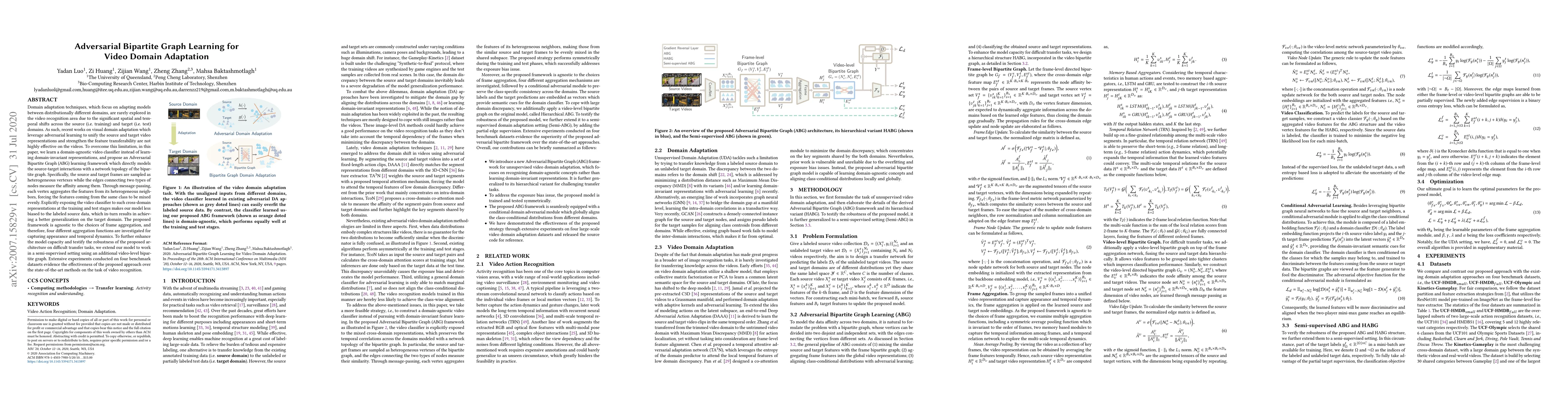 This paper proposes an Adversarial Bipartite Graph (ABG) learning framework for video domain adaptation, which models source-target interactions through a bipartite graph to unify video representations across different domains. The method enhances generalization by training a domain-agnostic classifier and leveraging message-passing to mix features from the same class, achieving superior performance over state-of-the-art methods on benchmark datasets.