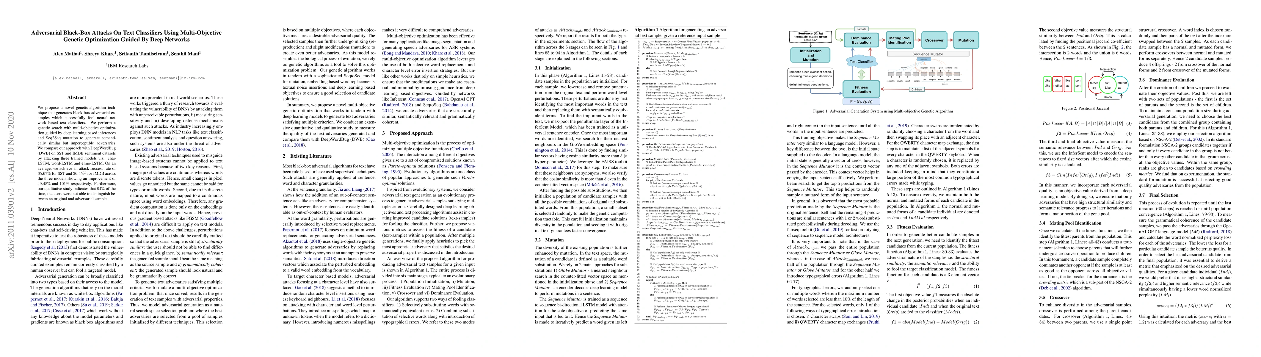 We propose a novel genetic-algorithm technique that generates black-box adversarial examples which successfully fool neural network based text classifiers. We perform a genetic search with multi-objective optimization guided by deep learning based inferences and Seq2Seq mutation to generate semantically similar but imperceptible adversaries. We compare our approach with DeepWordBug (DWB) on SST and IMDB sentiment datasets by attacking three trained models viz. char-LSTM, word-LSTM and elmo-LSTM. On an average, we achieve an attack success rate of 65.67% for SST and 36.45% for IMDB across the three models showing an improvement of 49.48% and 101% respectively. Furthermore, our qualitative study indicates that 94% of the time, the users were not able to distinguish between an original and adversarial sample.