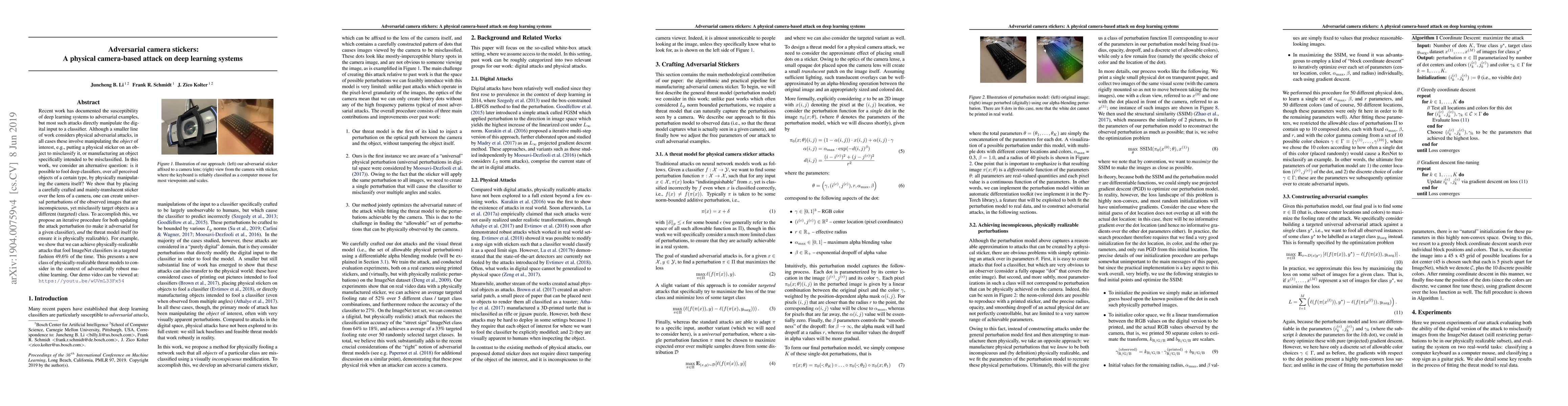Researchers demonstrated a new type of attack on deep learning systems using physical camera stickers that can create universal perturbations to misclassify target objects, fooling 49.6% of ImageNet classifiers.
